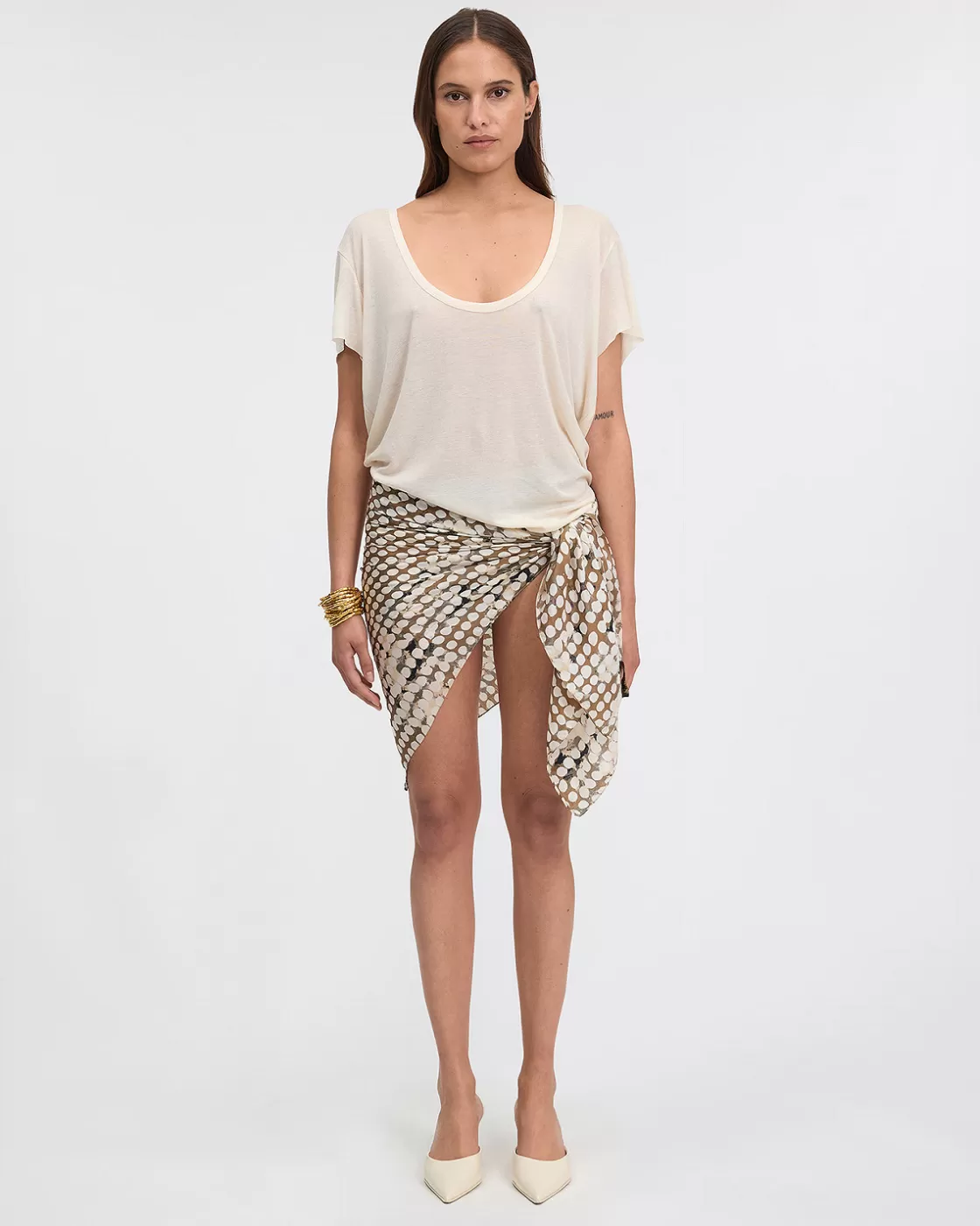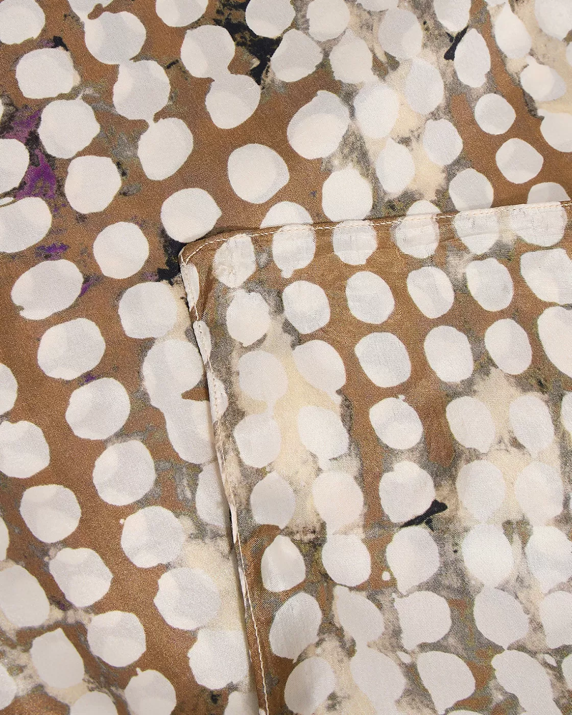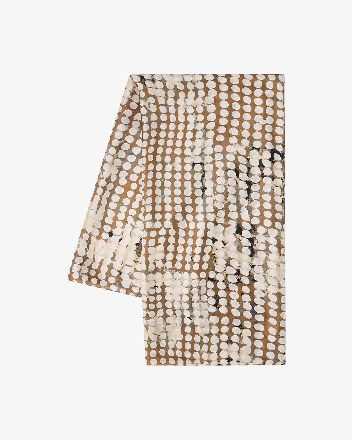 This silk scarf printed with large irregular polka dots in shades of beige is an elegant and distinctive fashion accessory.
