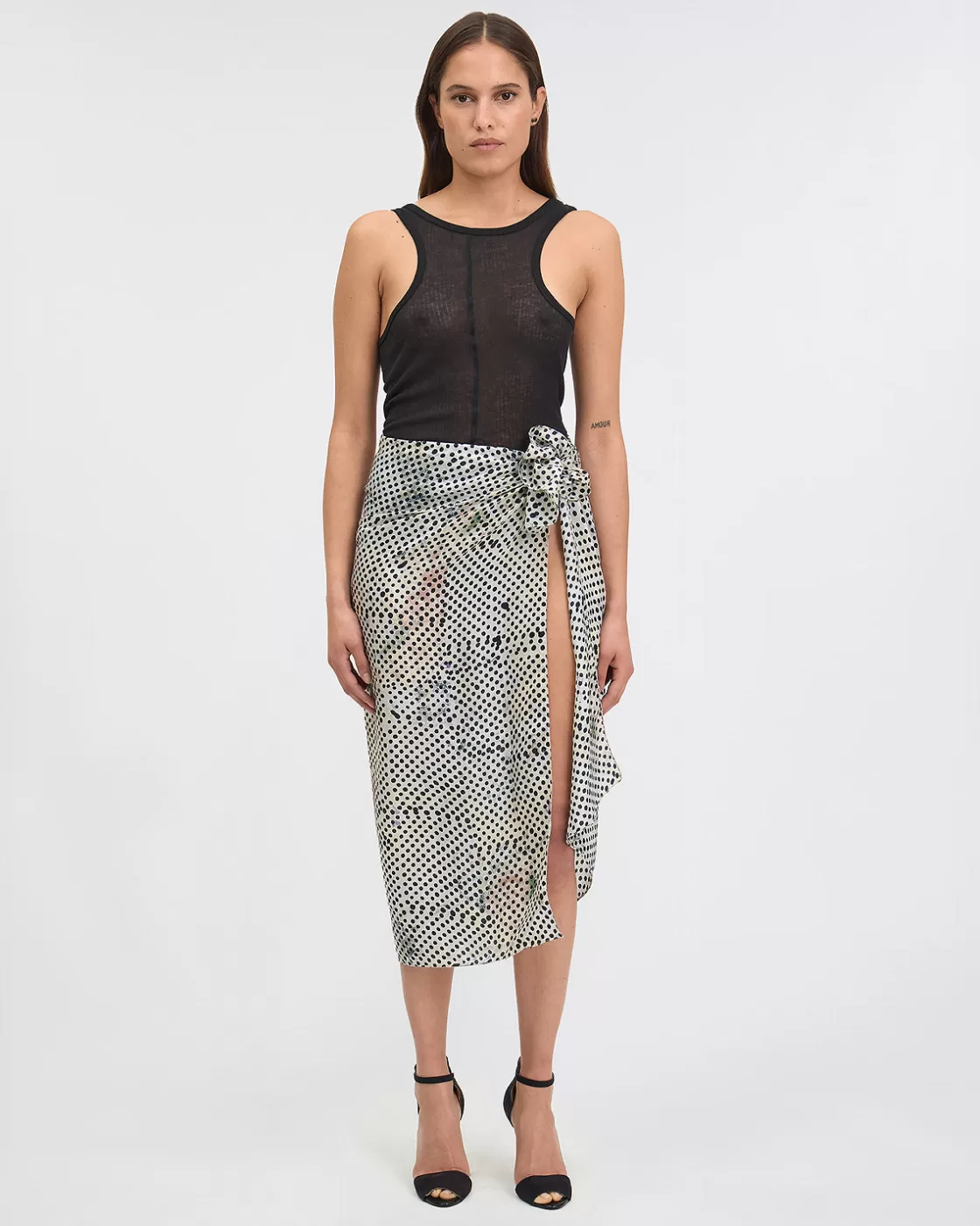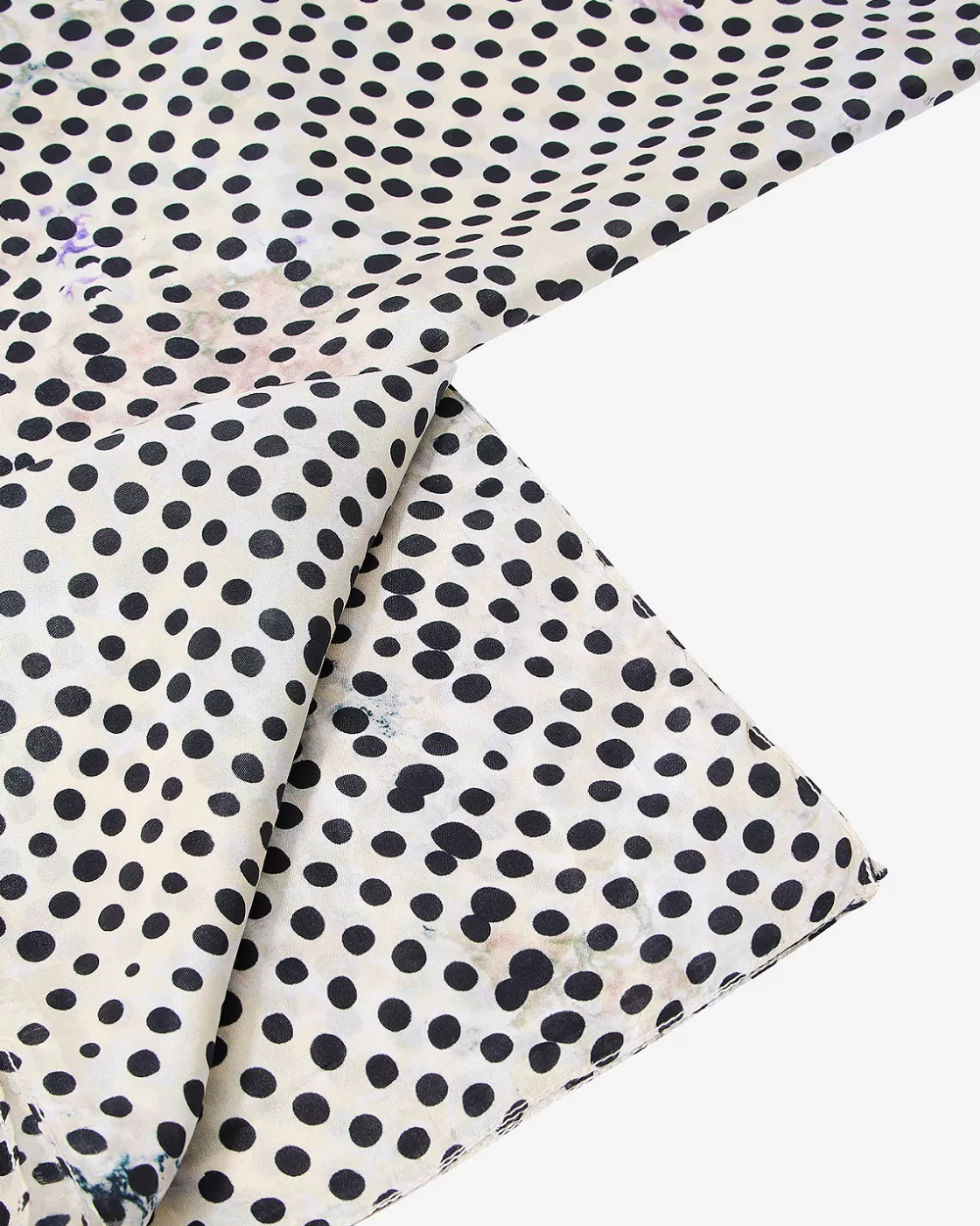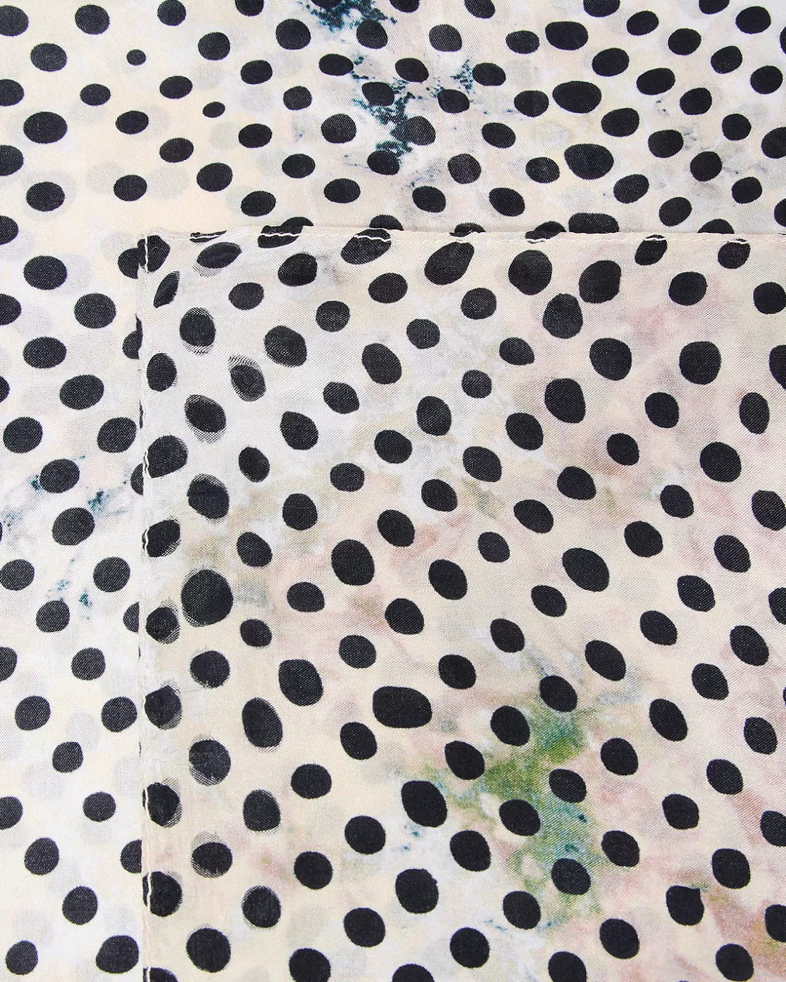 Silk is a luxurious material that lends a feeling of softness and flow, while the irregular polka dot print adds a touch of modernity and liveliness to the scarf.