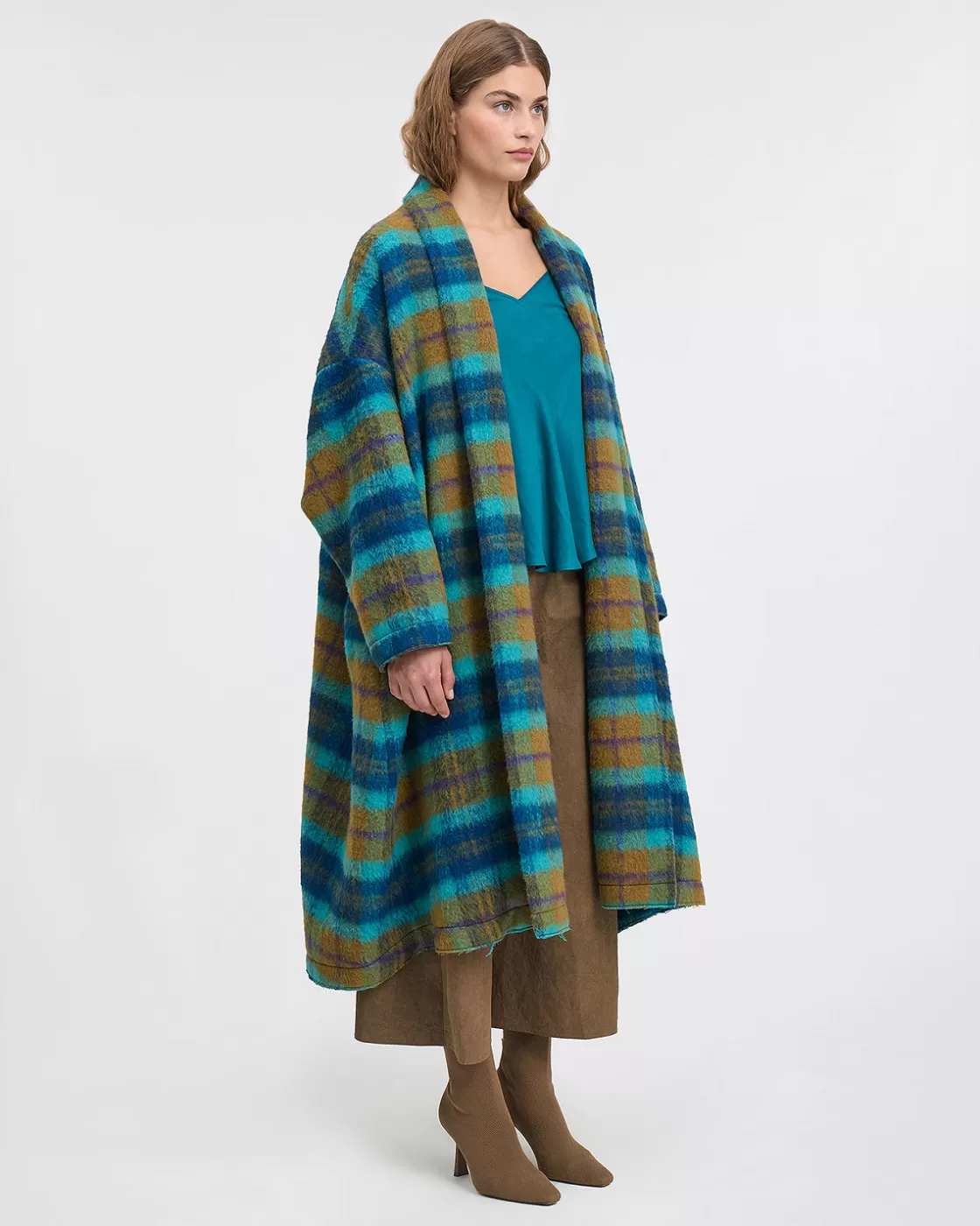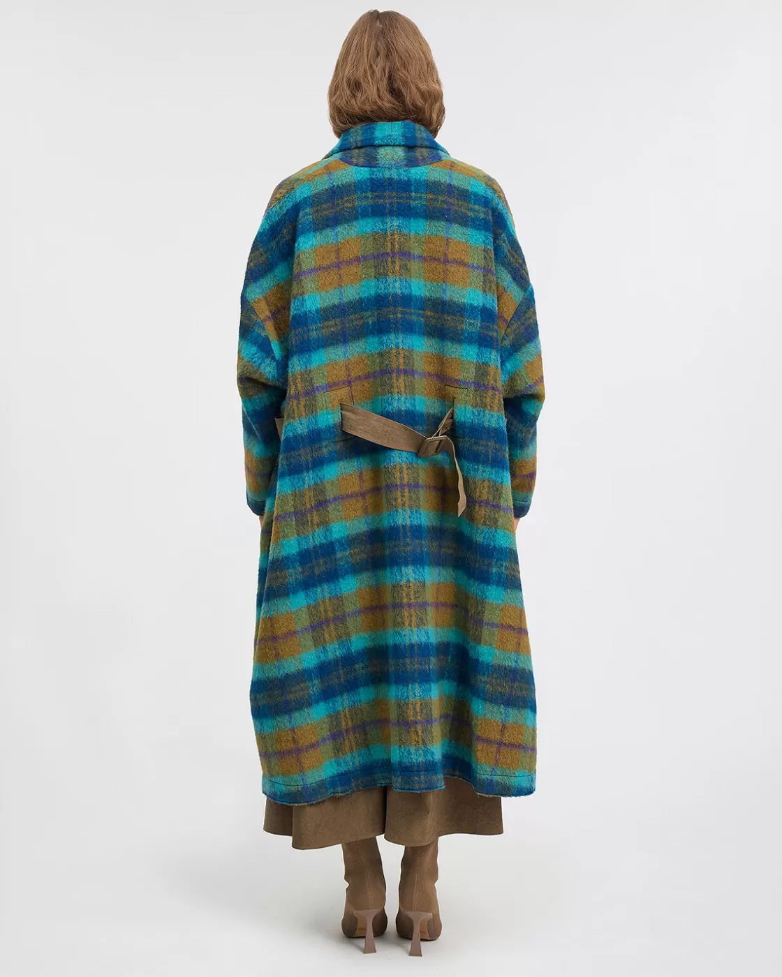 Adopt a bold style with our wool-blend tartan coat, in turquoise and ocher colors that evoke the warmth and brightness o…