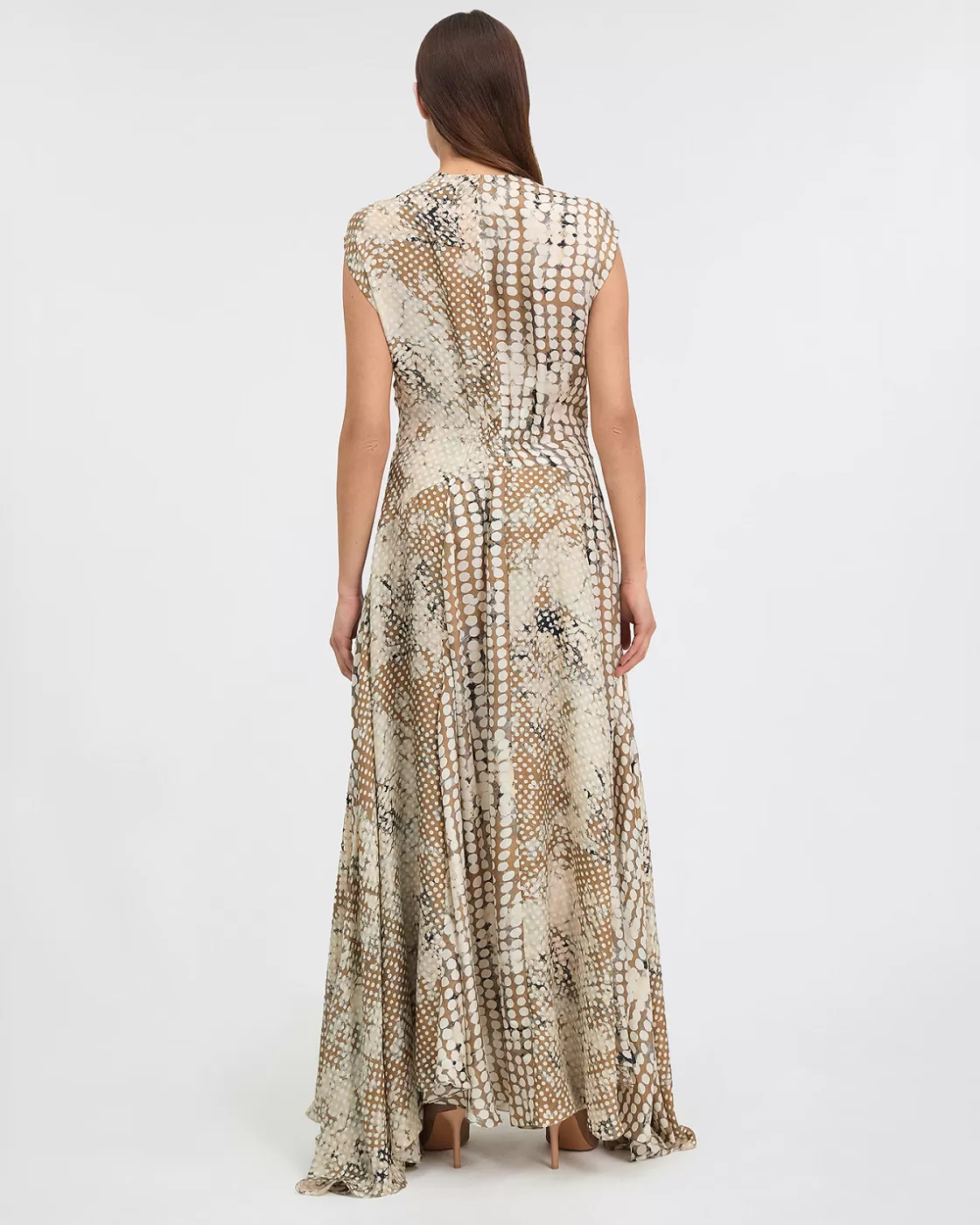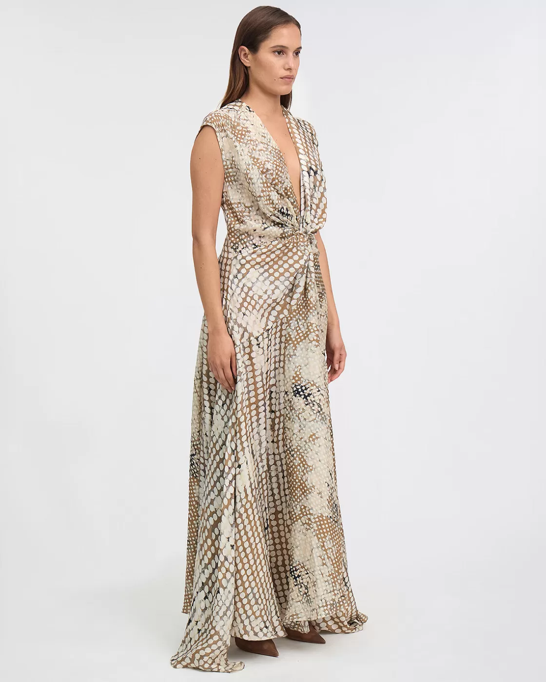 This long dress features a charming irregular beige polka dot print, bringing a touch of sophistication to its look.