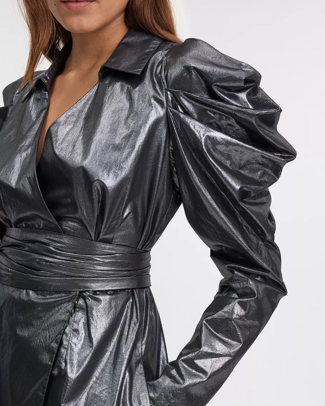 Immerse yourself in modern elegance with our silver coated cotton short dress.This refined piece combines comfort and sophistication for a look that won't go unnoticed. At the shoulders and upper sleeves, sophisticated details, such as strategically placed darts, add volume and character, creating a visually striking effect. The sleeves end in a refined way, with a straight bottom that highlights the silhouette. The dress stands out for its crossover cut, emphasizing the waist and creating a flattering silhouette. A matching cotton belt completes the look, allowing the dress to be cinched at the waist for a tailored fit and a finishing touch of sophistication.