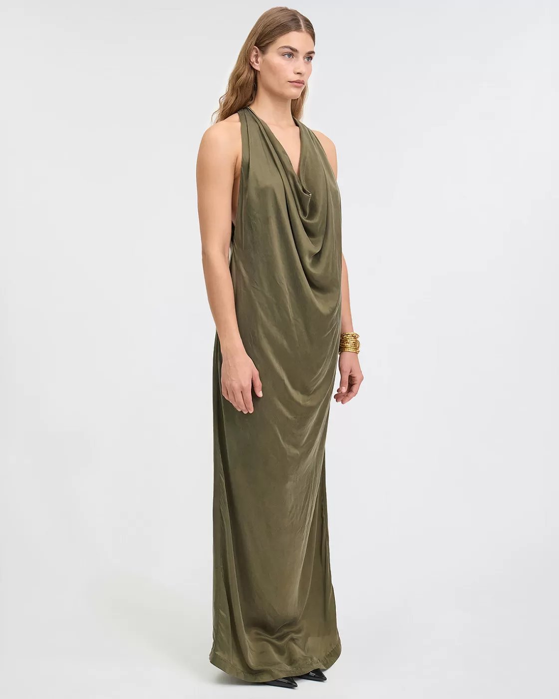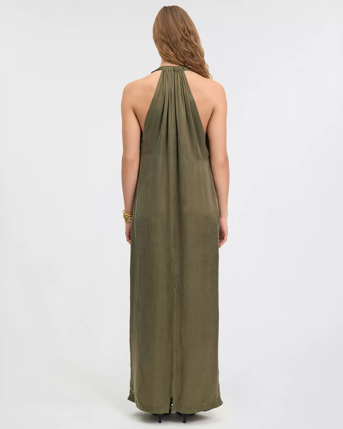 Immerse yourself in elegance with our long dress in cupro blend material, offering a satin finish close to silk to the touch. This khaki-colored dress features a long, figure-hugging cut, highlighting the silhouette with a sophisticated look. The front neckline offers a cowl effect, adding a touch of grace and femininity to the dress. At the back, the back is subtly more open and held in place by a central band, subtly revealing the skin while maintaining an elegant look. To add an extra touch of style, an elaborate belt is included, highlighting the waist and bringing a flawless finish to this already stunning piece.