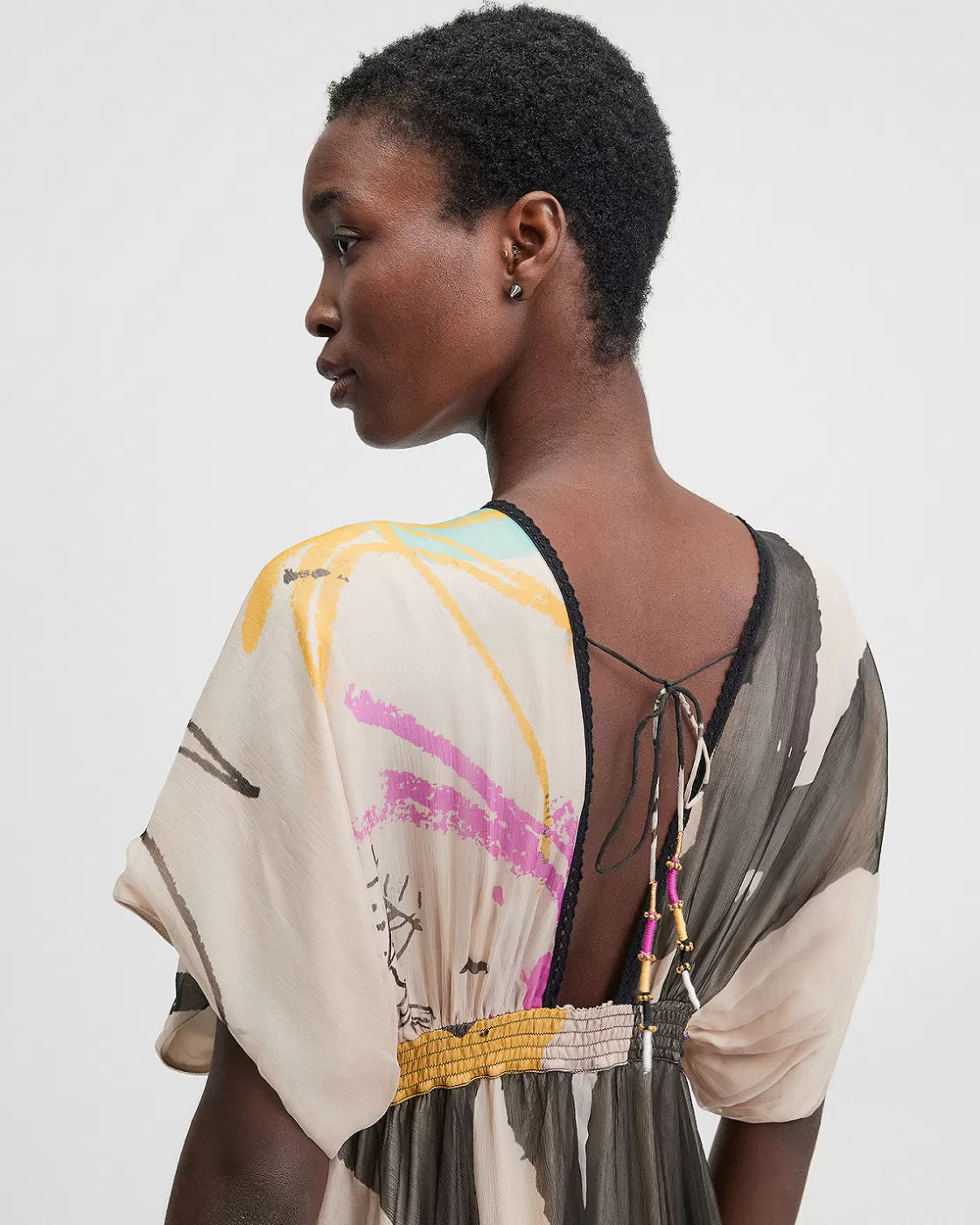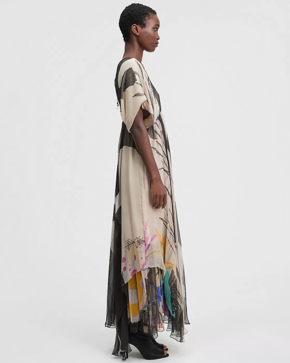Our house was inspired by art to create this splendid long dress, bursting with multiple colors. Its pretty flowing volume from below the bust and its dropped sleeves give it an irresistible romantic touch.