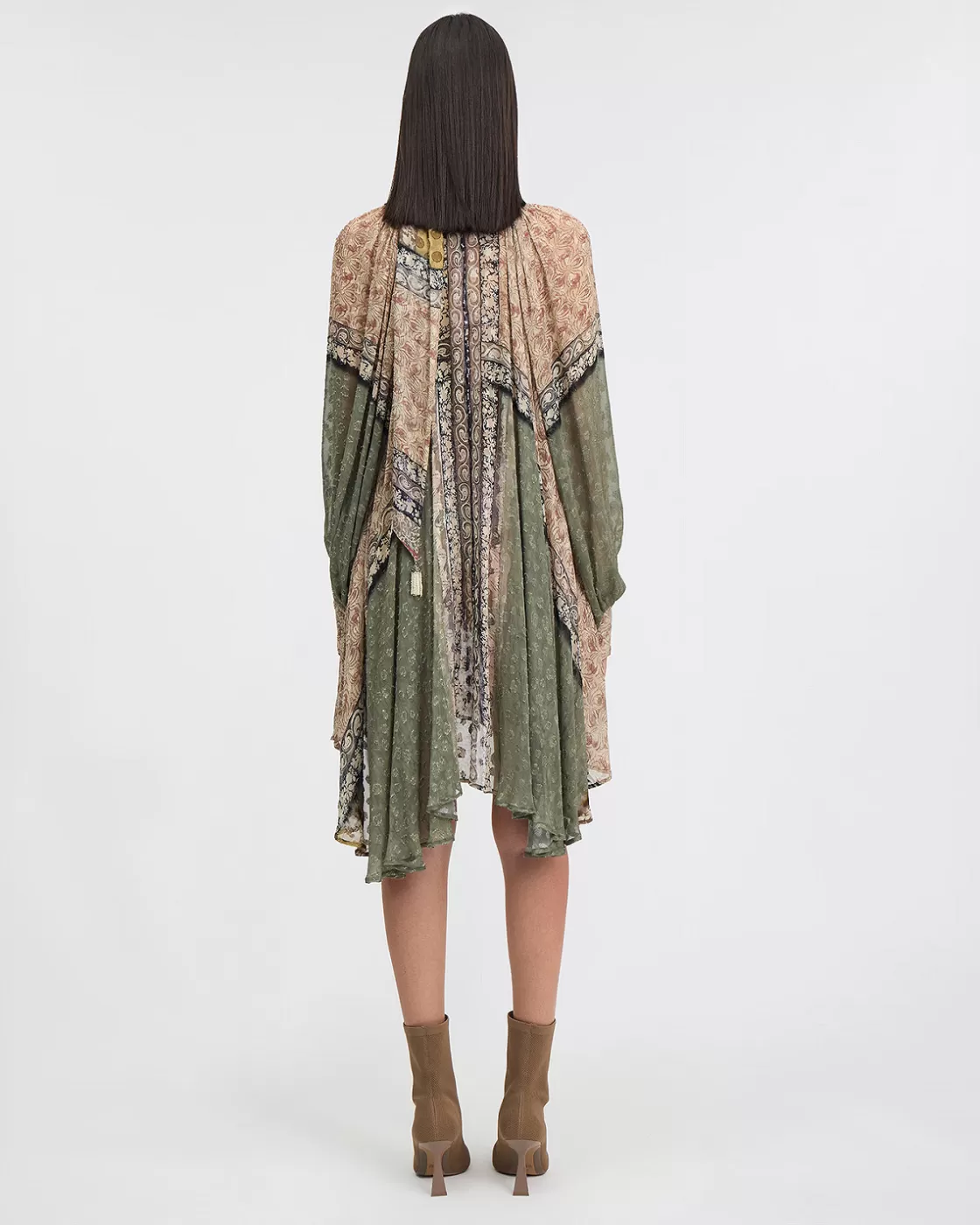 Immerse yourself in elegance with our short dress in jacquard viscose patch, where devoré fabrics and cut threads combine harmoniously in khaki and ocher tones. Our dress features a wide cut that offers ease on the body, allowing you to move freely while remaining chic. The long sleeves add a touch of sophistication, while the lining ensures perfect opacity to avoid any see-through. Whether for a casual day or a special evening, this dress is a choice that ensures style and comfort in all circumstances.