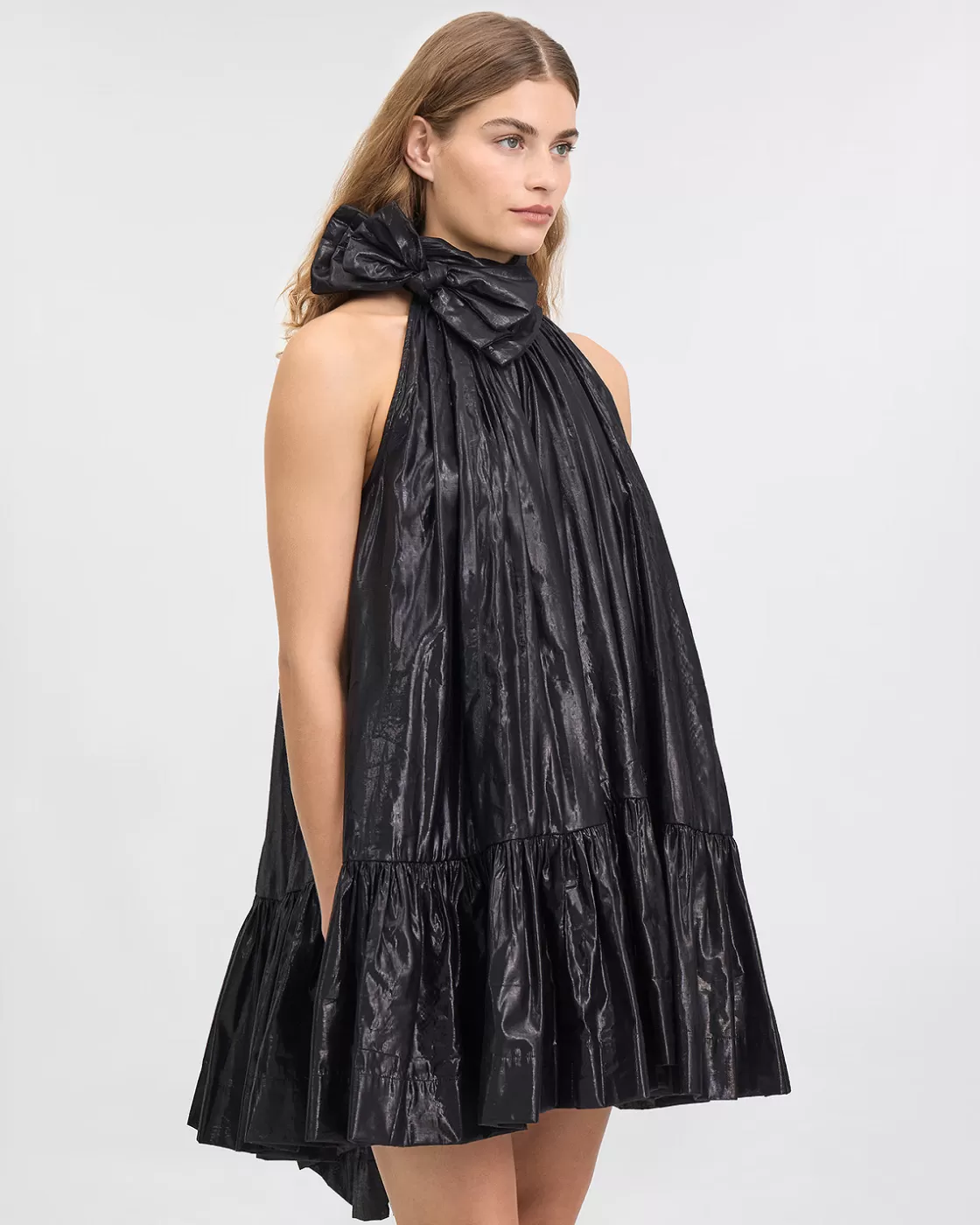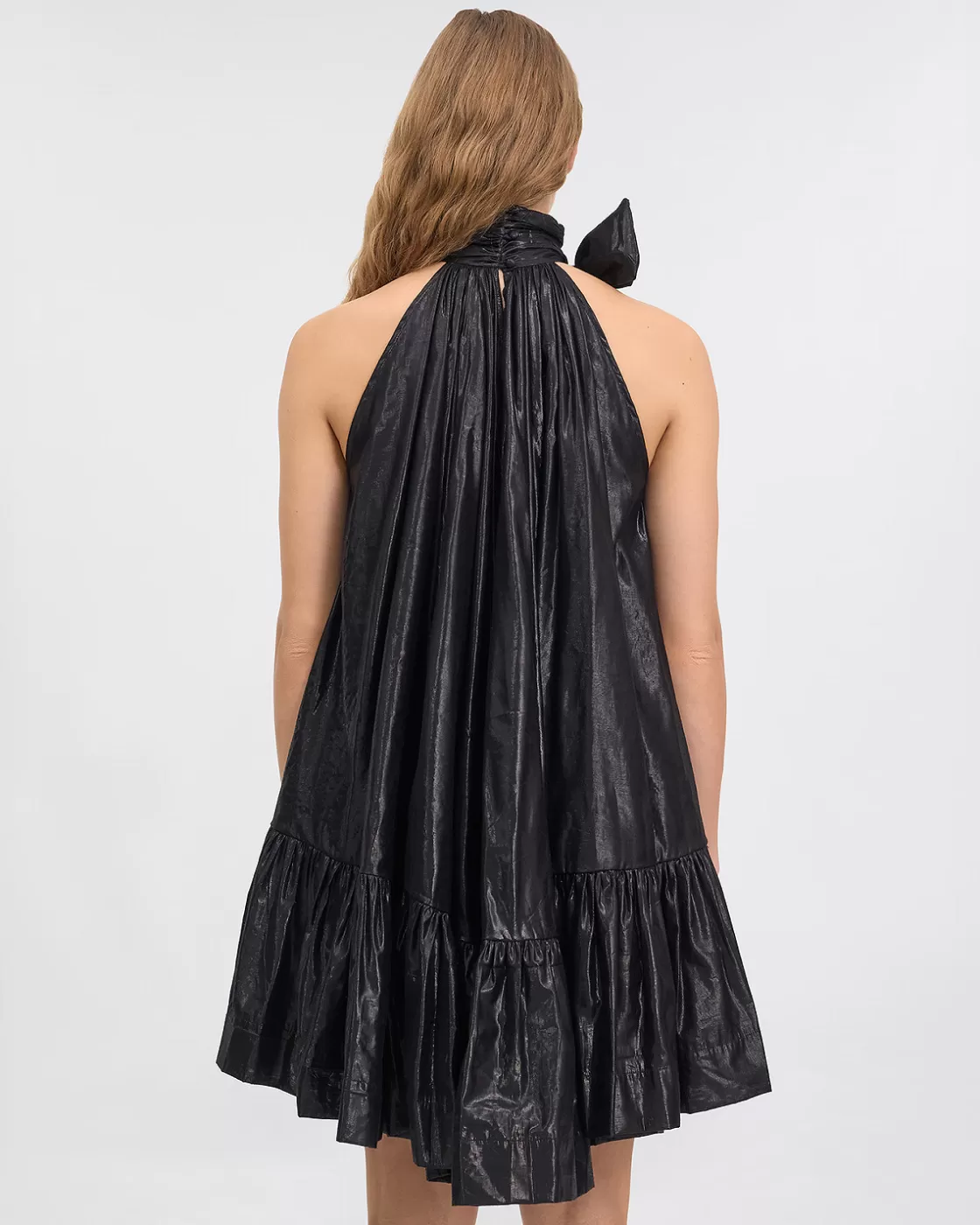 This feminine dress in woven yarn with black lurex is a perfect blend of style and glamour. Its loose cut, with American armholes, offers a relaxed and fluid silhouette. The subtle addition of lurex thread adds a touch of sparkle and sophistication to the dress, allowing it to subtly shine under the light. The high neckline creates an elegant and modern look, while the large removable bow adds a playful and versatile touch to the dress. You can choose to tie it up for a more sophisticated look or remove it for a more casual style. A charming detail: a ruffle at the bottom of the model adds a feminine and romantic touch, creating a fluid and graceful movement with each step.