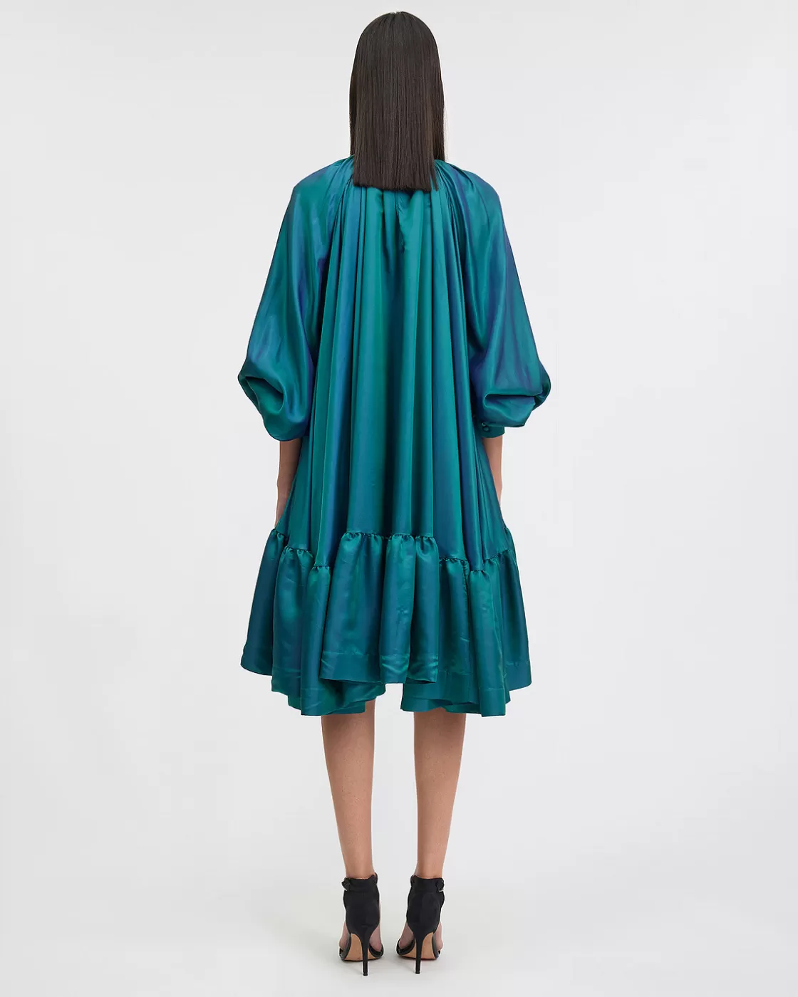 Let your elegance shine in our turquoise satin mid-length dress, slightly shiny for a luxurious effect. This dress has a soft and wide cut, combining comfort and sophistication. A delicate ruffle at the bottom adds a touch of femininity and movement to this piece. The mock neck with tie back adds a refined touch, while the long sleeves provide stylish coverage.