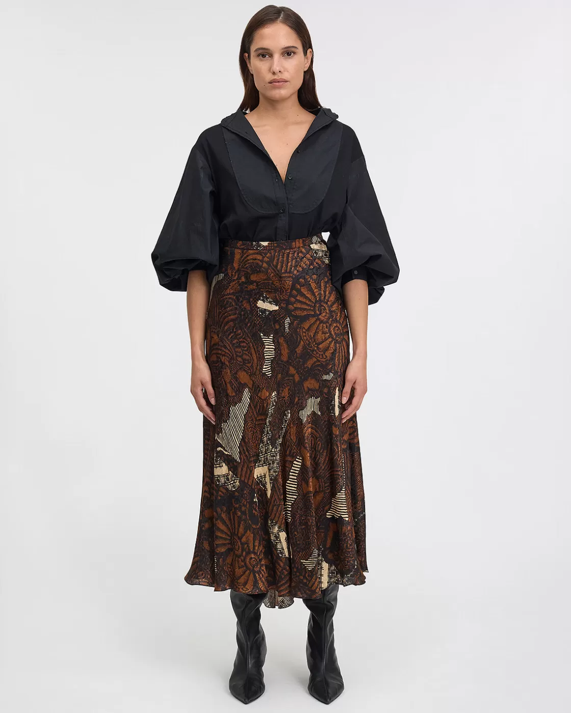 This long, straight skirt is a true tribute to elegance and refinement. Its placed print adds an artistic and captivating touch to the piece, evoking the rich colours and patterns of autumn. To accentuate its allure, additional godet pleats have been added to the back of the skirt, providing subtle volume and a graceful silhouette with every step. The discreet zipper at the back ensures a perfect fit and a flawless finish.