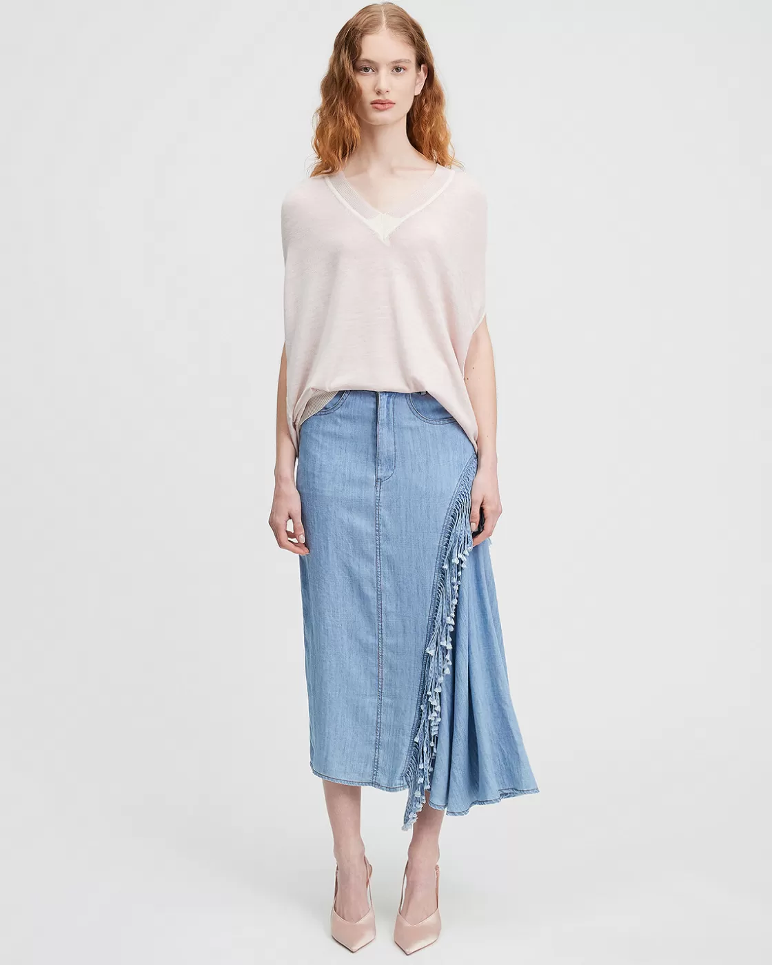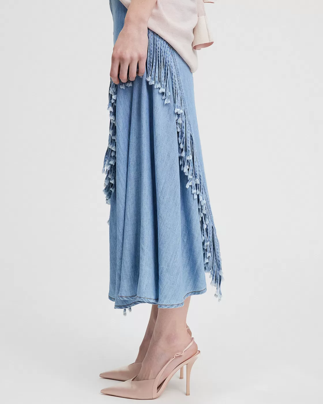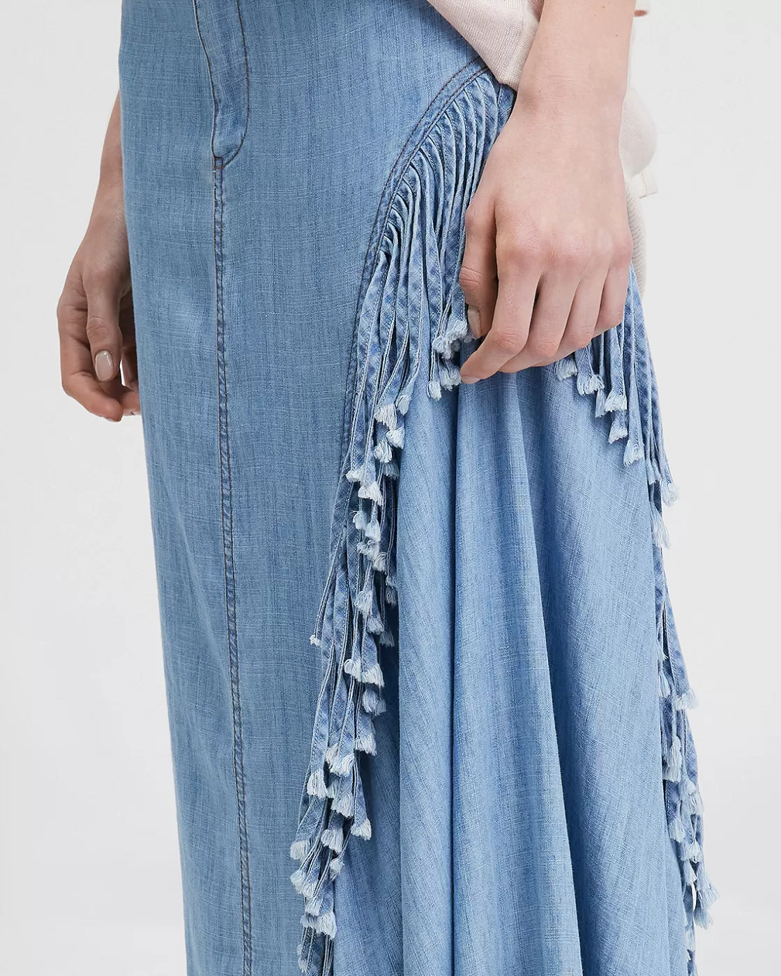Our unique straight skirt is made from a blend of lyocell and linen that evokes the denim spirit. This skirt features the classic jeans pockets, bringing a touch of familiarity to the piece. Its particularity lies in the band of fringes and the panel of fabric that adorns one of the sides, adding a touch of originality and dynamism to this classic model. Feminine and trendy, this skirt is perfect to complete your casual outfit with a touch of boldness and style.