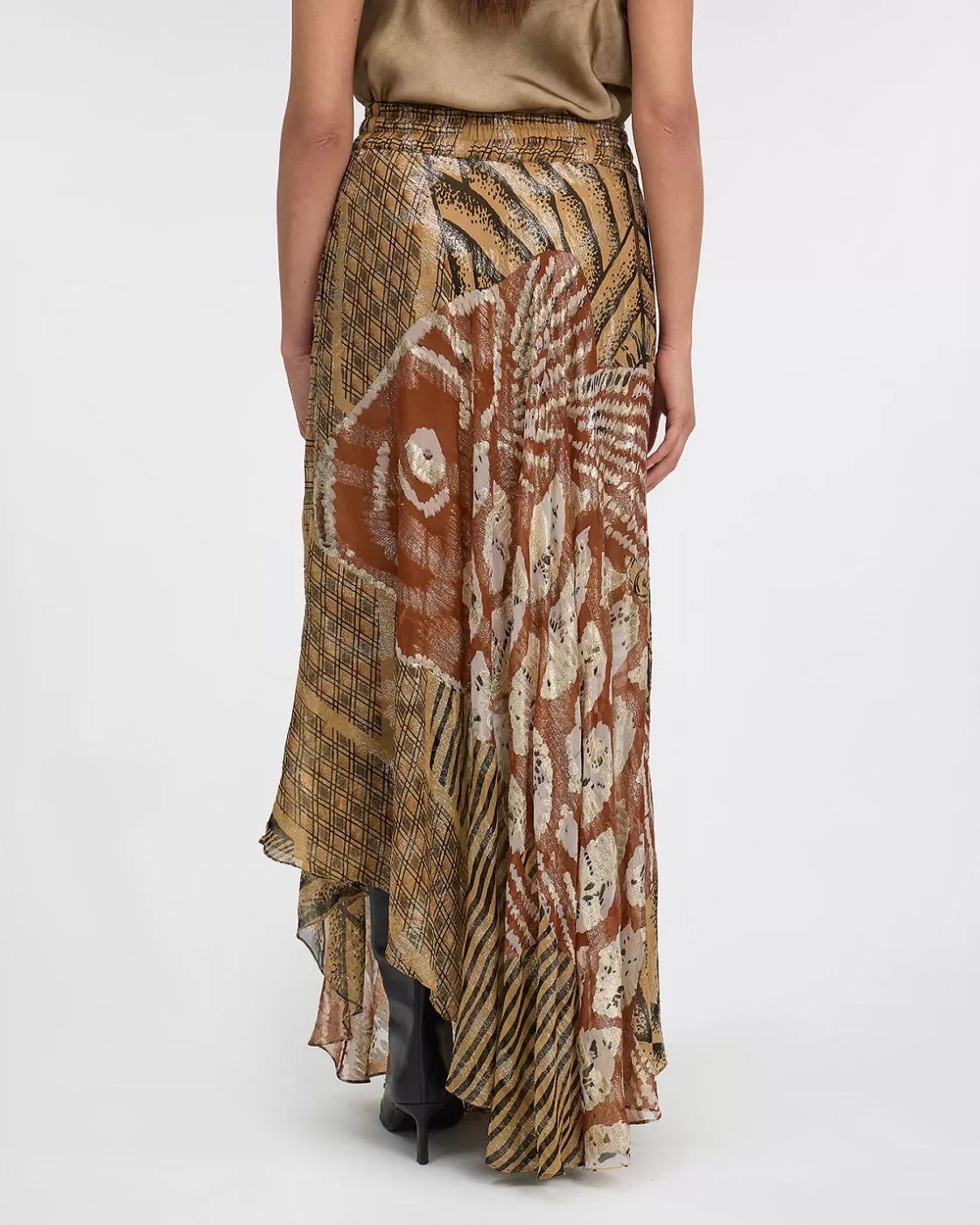 Immerse yourself in originality with our slightly unstructured long skirt, a bold blend of comfort and style. Made from a lamé viscose fabric and shimmering gold thread, this skirt catches the eye with its “carpe coy” print judiciously placed on the model. Featuring an elastic waist and side pockets for a practical touch, this skirt offers a comfortable fit and freedom of movement. Its delicate asymmetry adds an artistic dimension to your outfit, while its fluid, slightly flared cut creates graceful movement with every step.