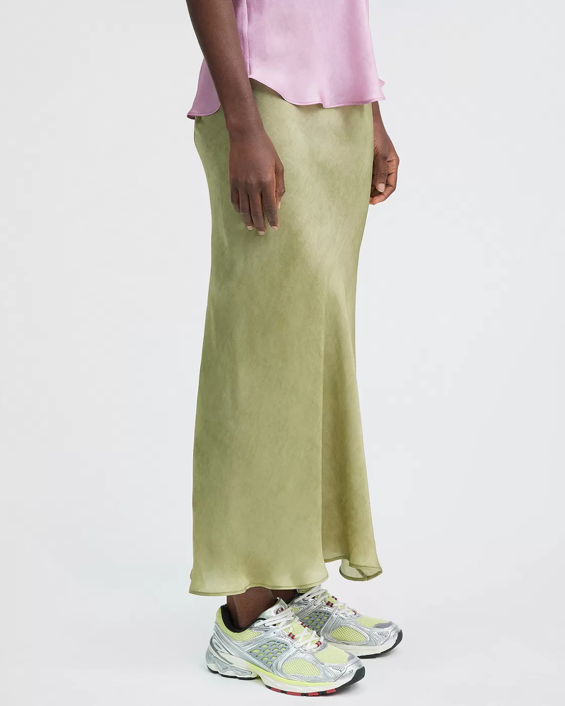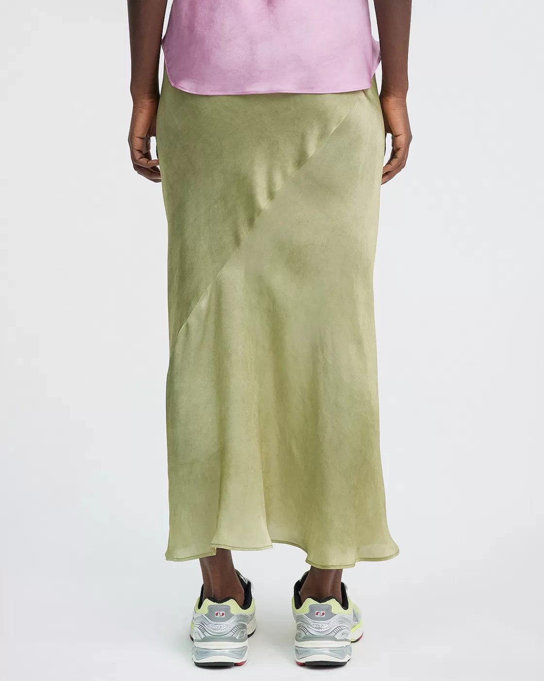 Long, straight skirt in faux olive-colored silk is cut on the bias to offer optimal comfort.