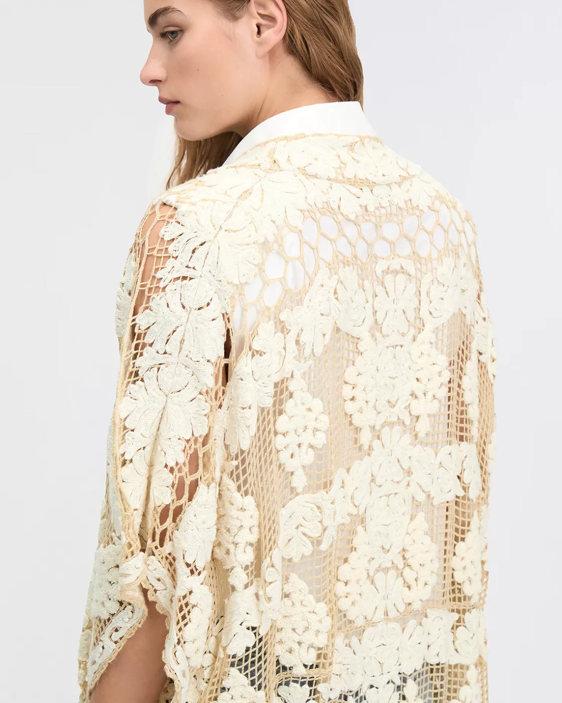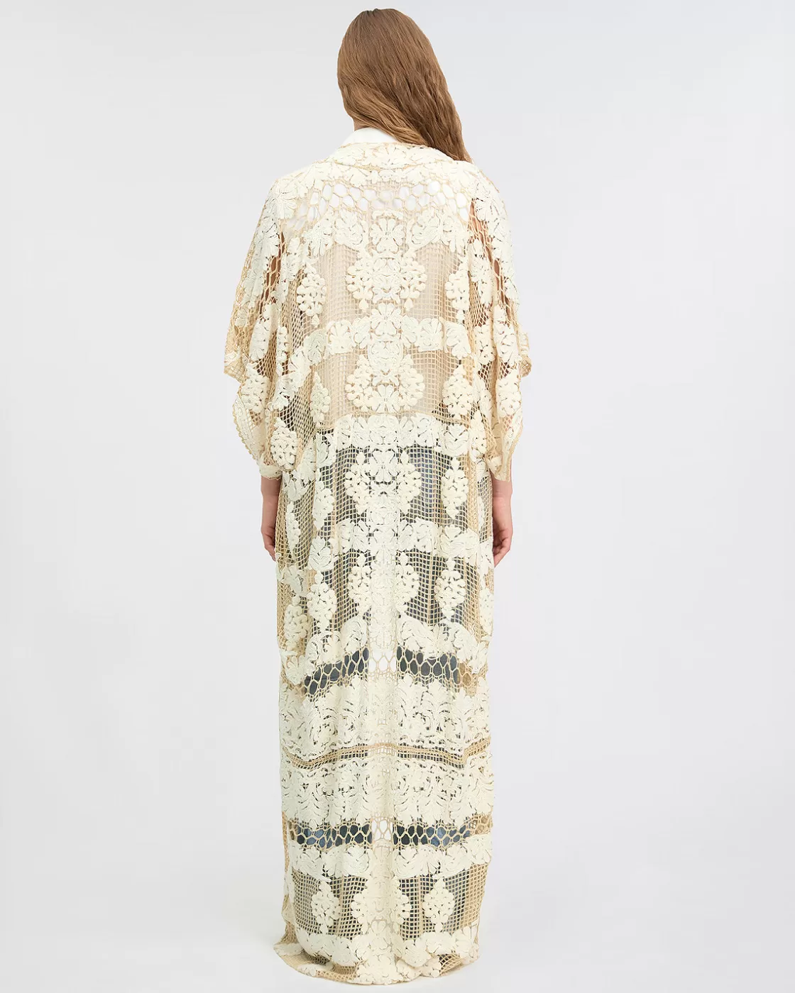 Made in a timeless ecru shade, this kimono is decorated with ivory placed embroidery and mesh effects, adding an artistic dimension to its look.