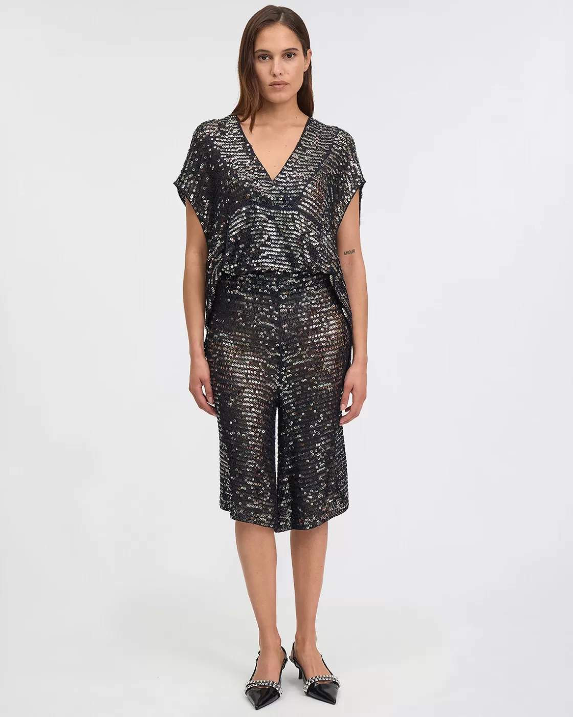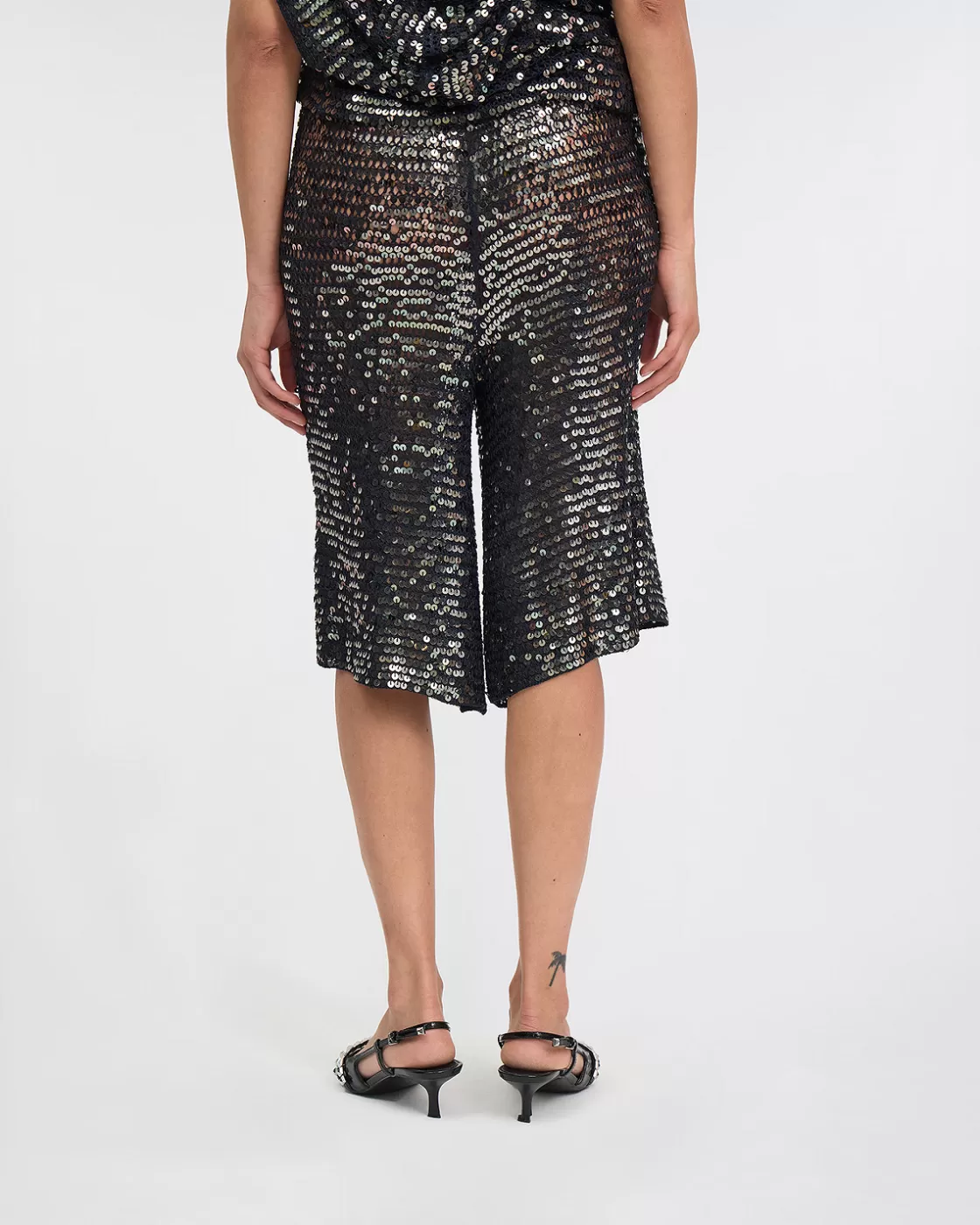 Our latest model of sequin mesh Bermuda shorts is an elegant and trendy piece to add a touch of glamor to your wardrobe! Made from a flowing anthracite-colored fabric that perfectly hugs your curves, these Bermuda shorts offer optimal comfort thanks to their elastic waistband and the flexibility of their material. Its subtle shine catches the eye and adds a touch of sophistication to any outfit.