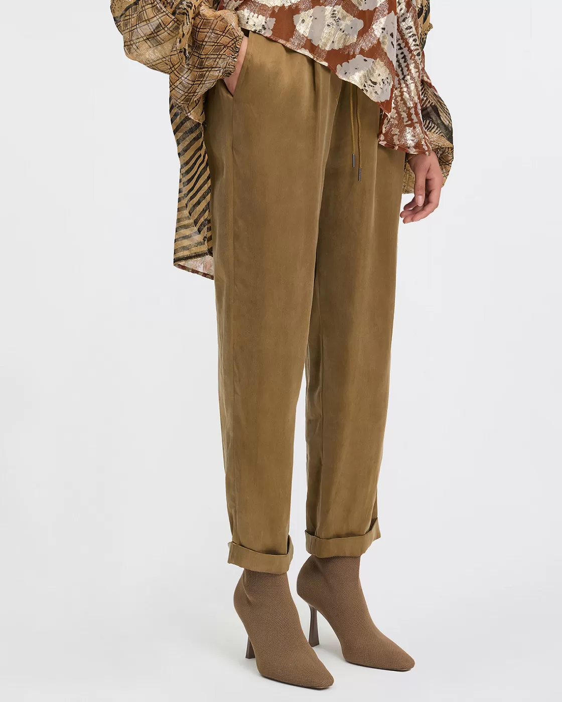 Opt for a casual but chic style with our straight-cut pants in a satin fabric-effect lyocell and viscose blend, in an elegant bronze shade. Featuring an elastic waistband and practical side pockets, these pants combine comfort and functionality. The little cuff at the bottom adds a classic touch, perfect for a versatile look that can go from day to night in the blink of an eye. These pants offer the perfect balance between style and comfort.