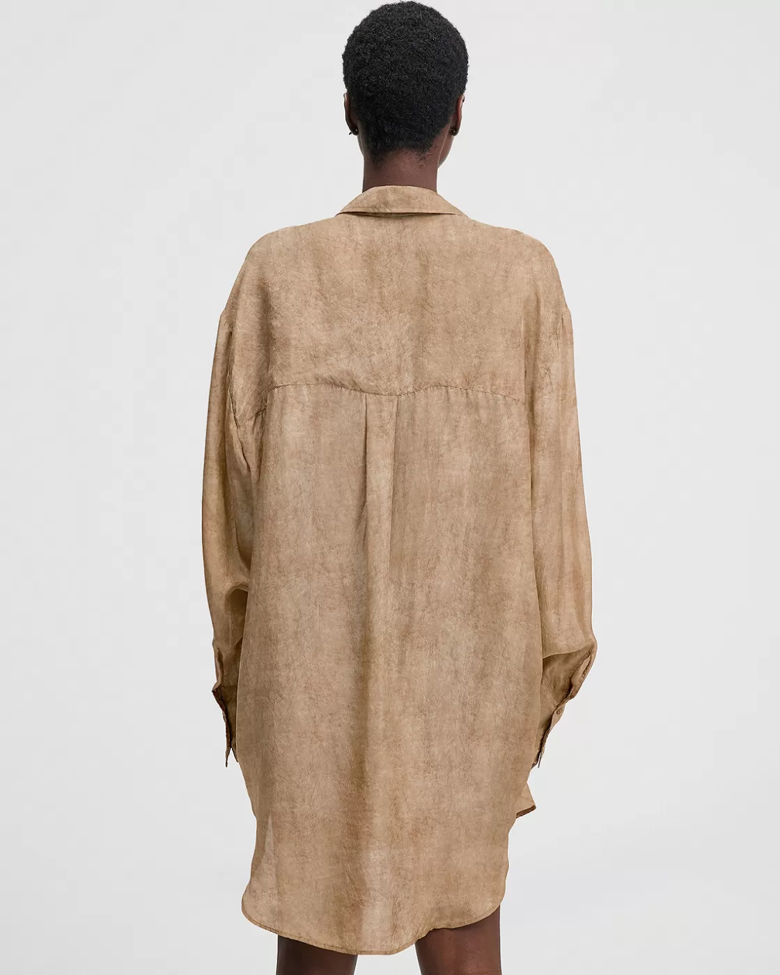 This habotai silk shirt embodies elegance and refinement with its flowing, long cut. Made from premium silk fabric, it feels soft and light on the skin. Its delicate print in shades of beige adds a touch of subtlety and sophistication to its look.