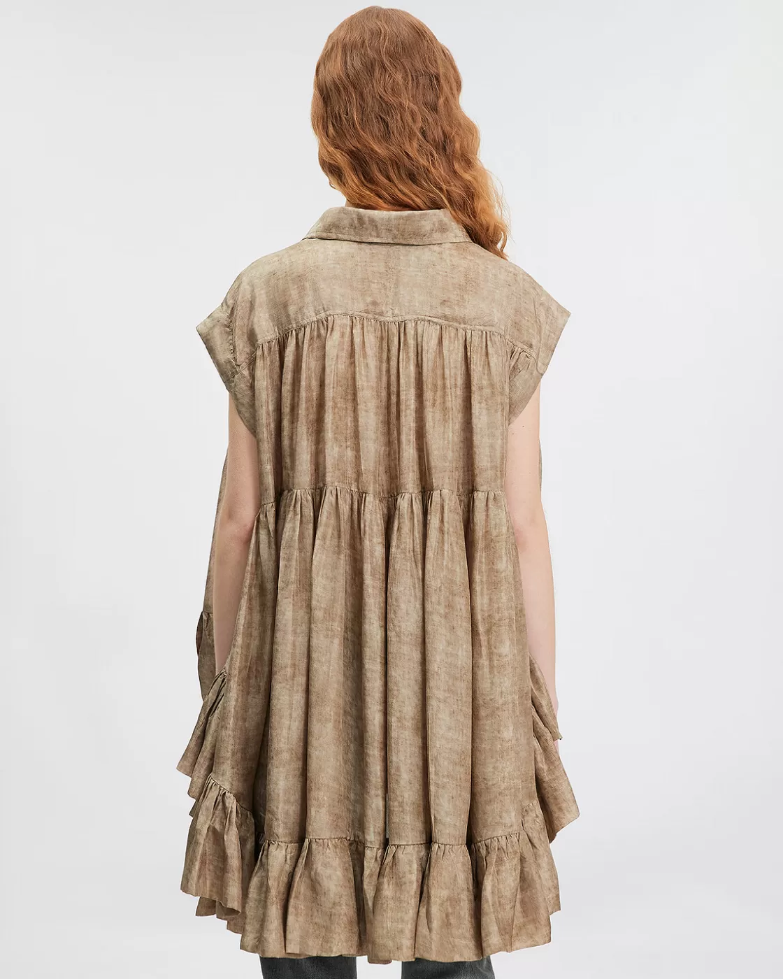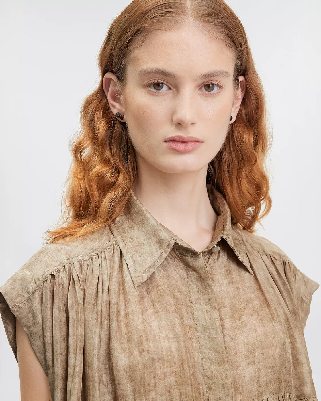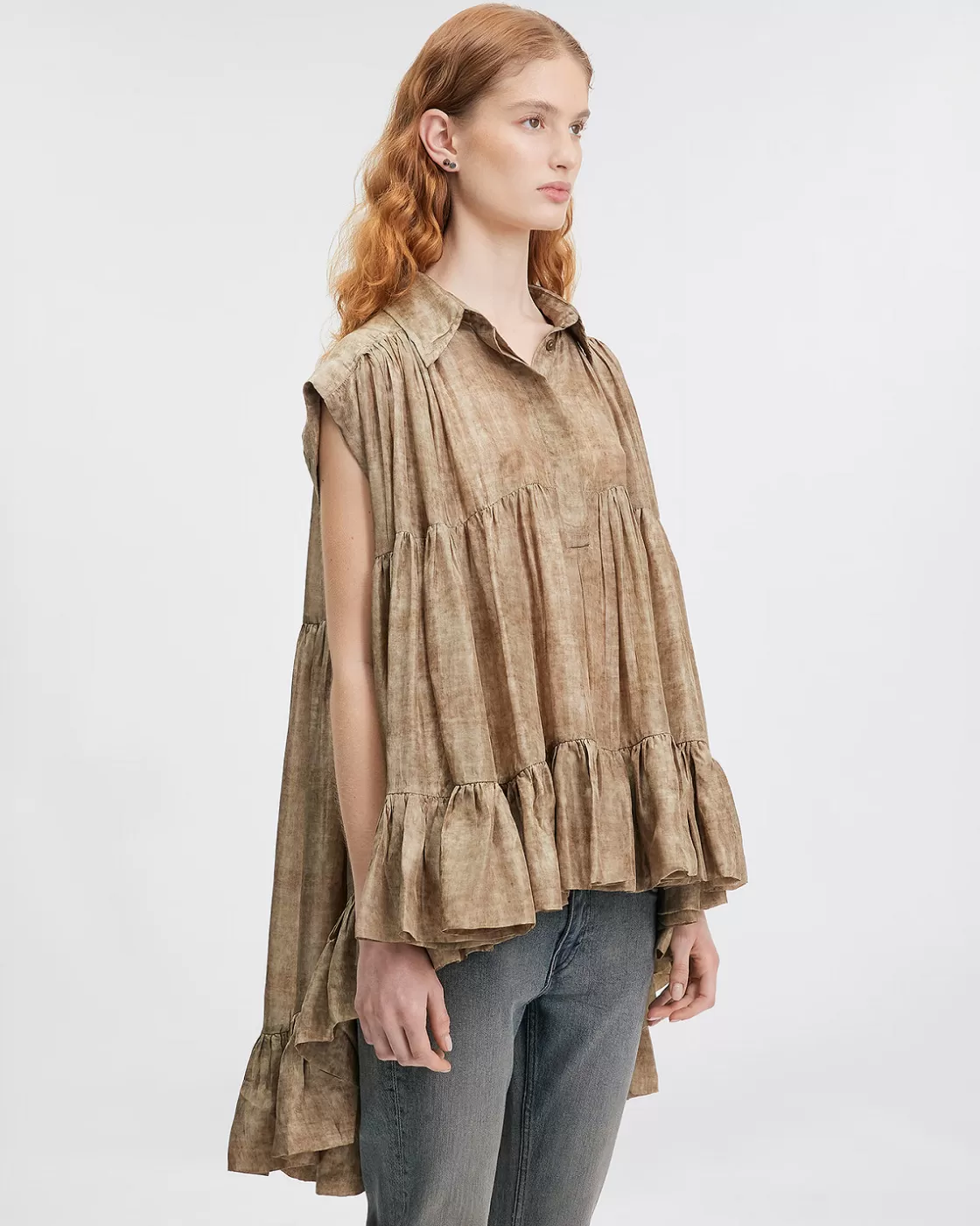 Made from habotai silk in shades of beige, its loose, unstructured cut creates a fluid effect, with a longer length at the back, adding a touch of modernity to its look.
