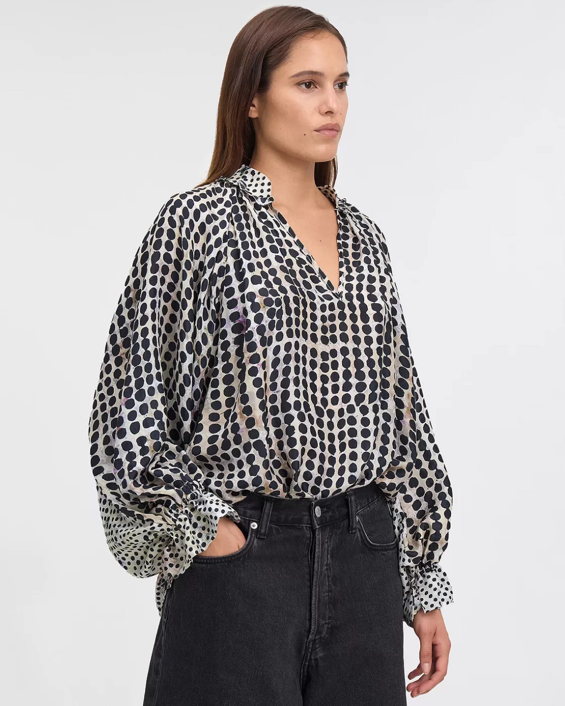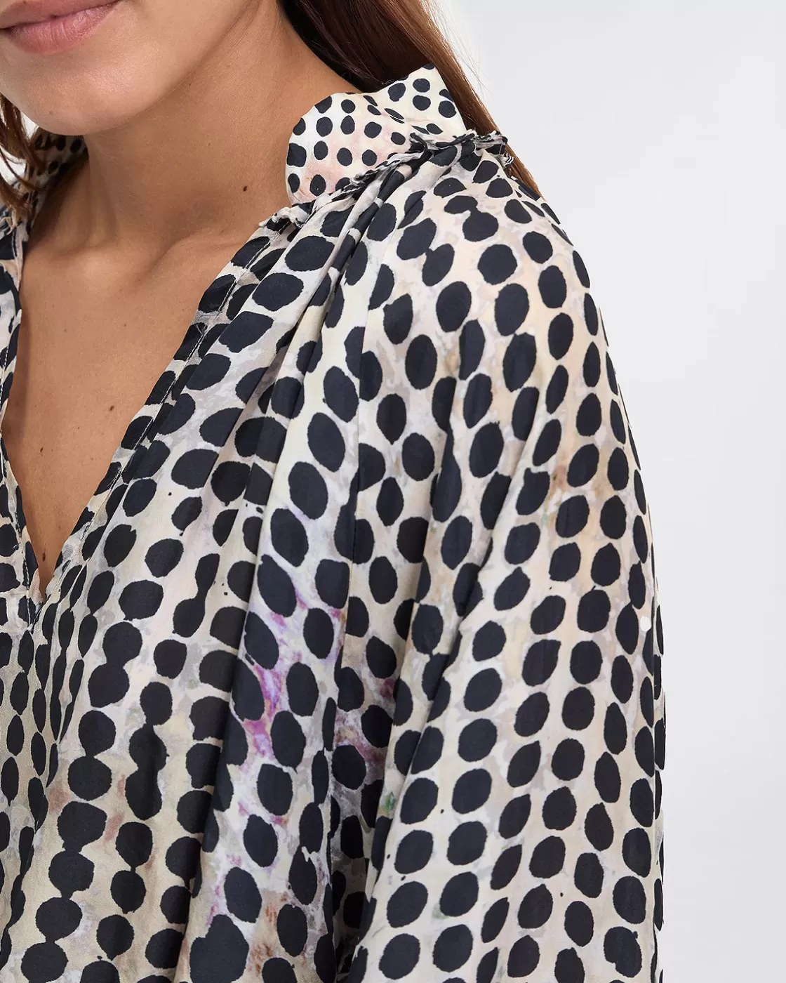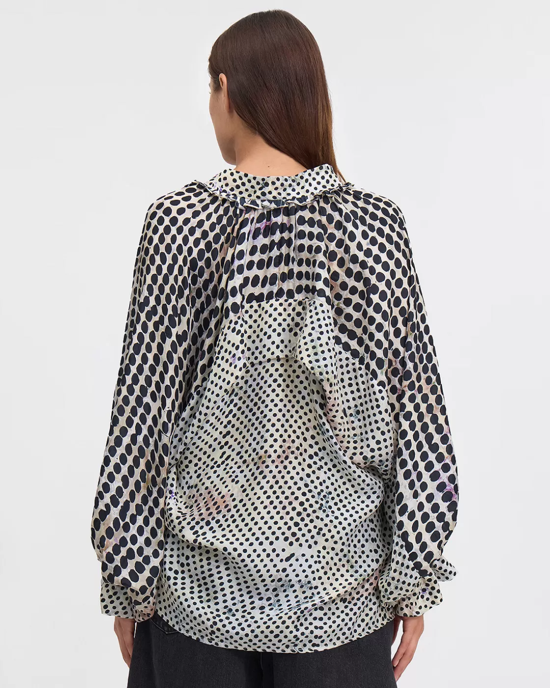 This silk shirt is decorated with a delicate pattern of irregular black polka dots, adding a touch of charm and originality to its look.