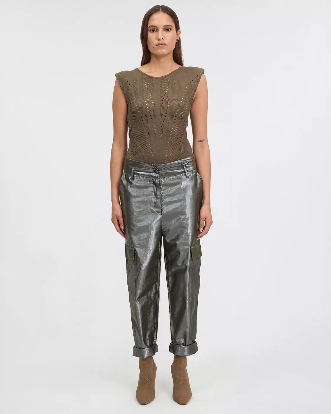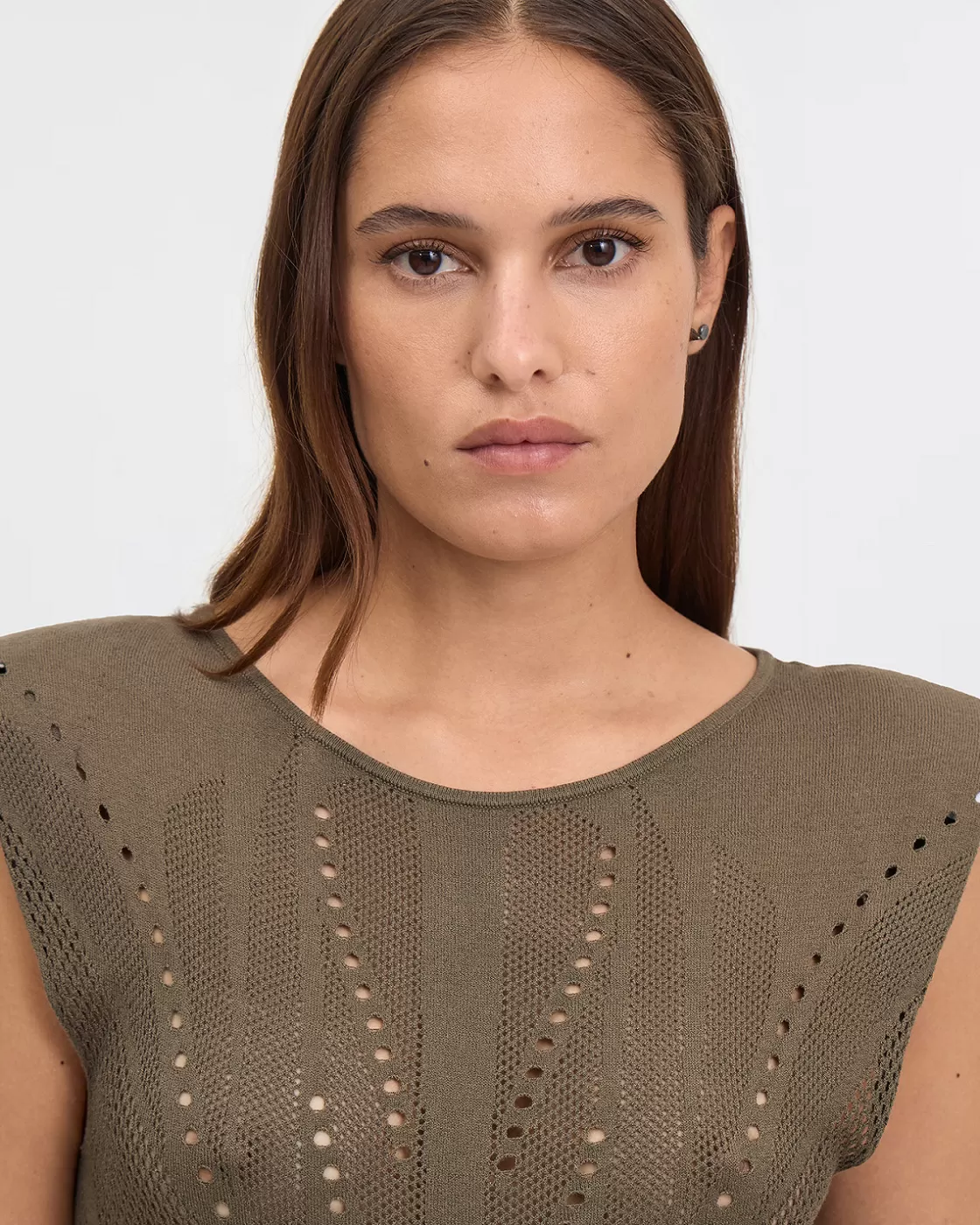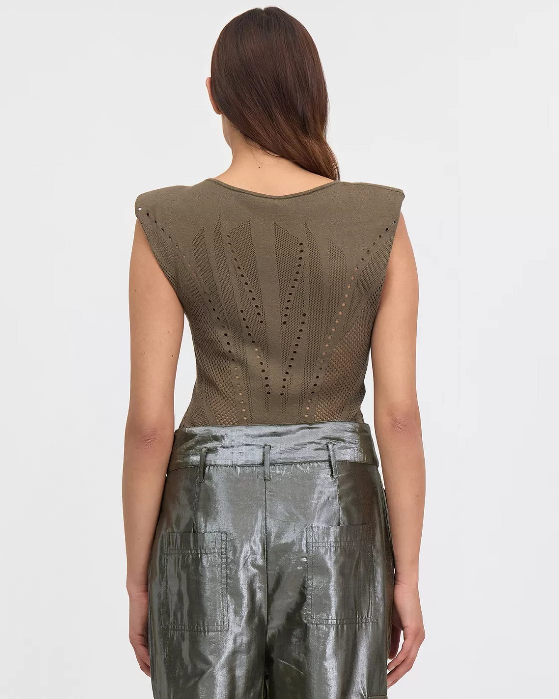 This sleeveless top features an elegant khaki color and shoulder pads that add a touch of structure and sophistication. Made in delicate pointelle with placed designs, it offers a subtle texture and an elaborate pattern. Its straight and short cut gives it a modern and dynamic look, perfect for an elegant look.