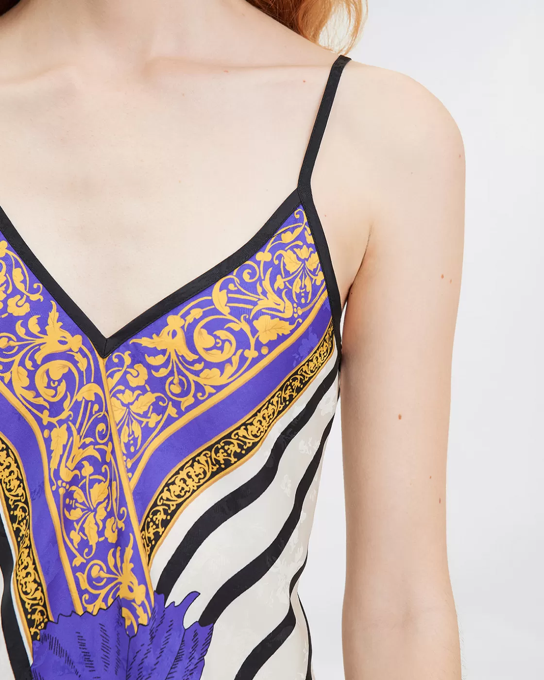 Immerse yourself in delicacy with our top with thin adjustable straps. Its front is decorated with a play of stripes and floral and arabesque designs which elegantly highlights the neckline.