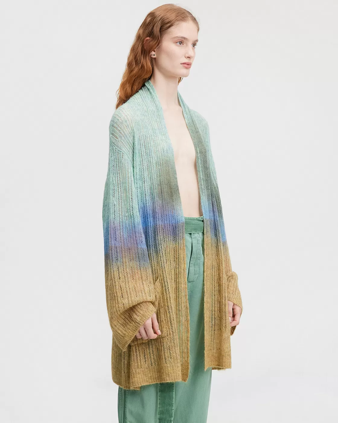 This exceptional cardigan is made from an alpaca lace knit, offering both warmth and elegance.