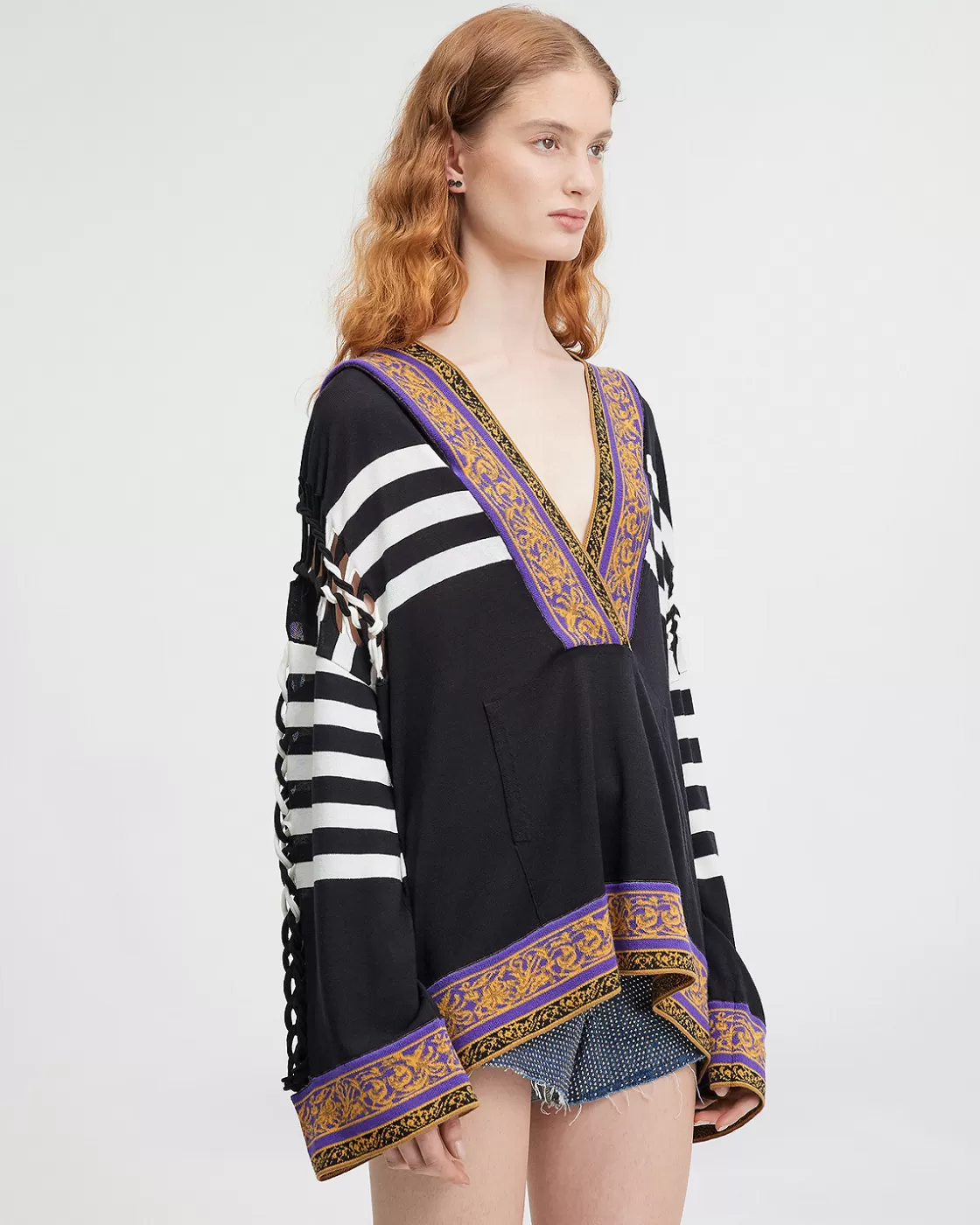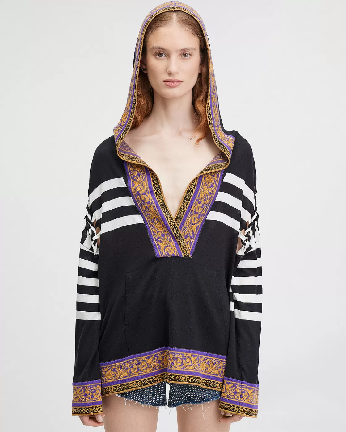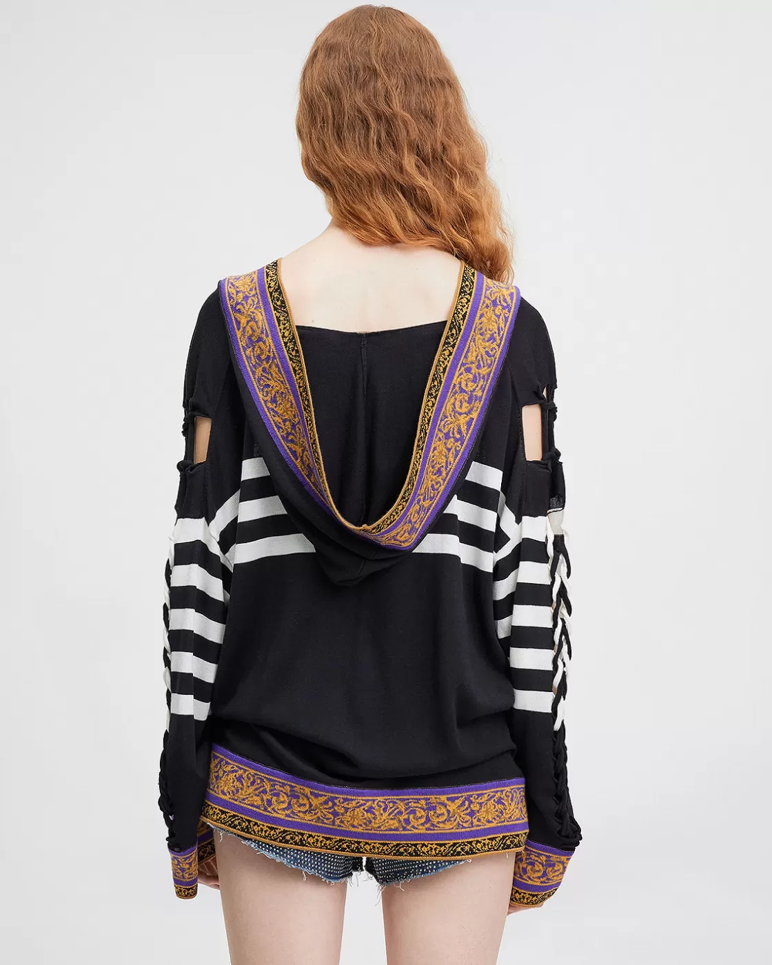 Originality for our hooded sweater, made in a mix of stripes, handmade braids and jacquard banding. This beautiful garment offers a unique combination of textures and patterns for an original and sophisticated style.