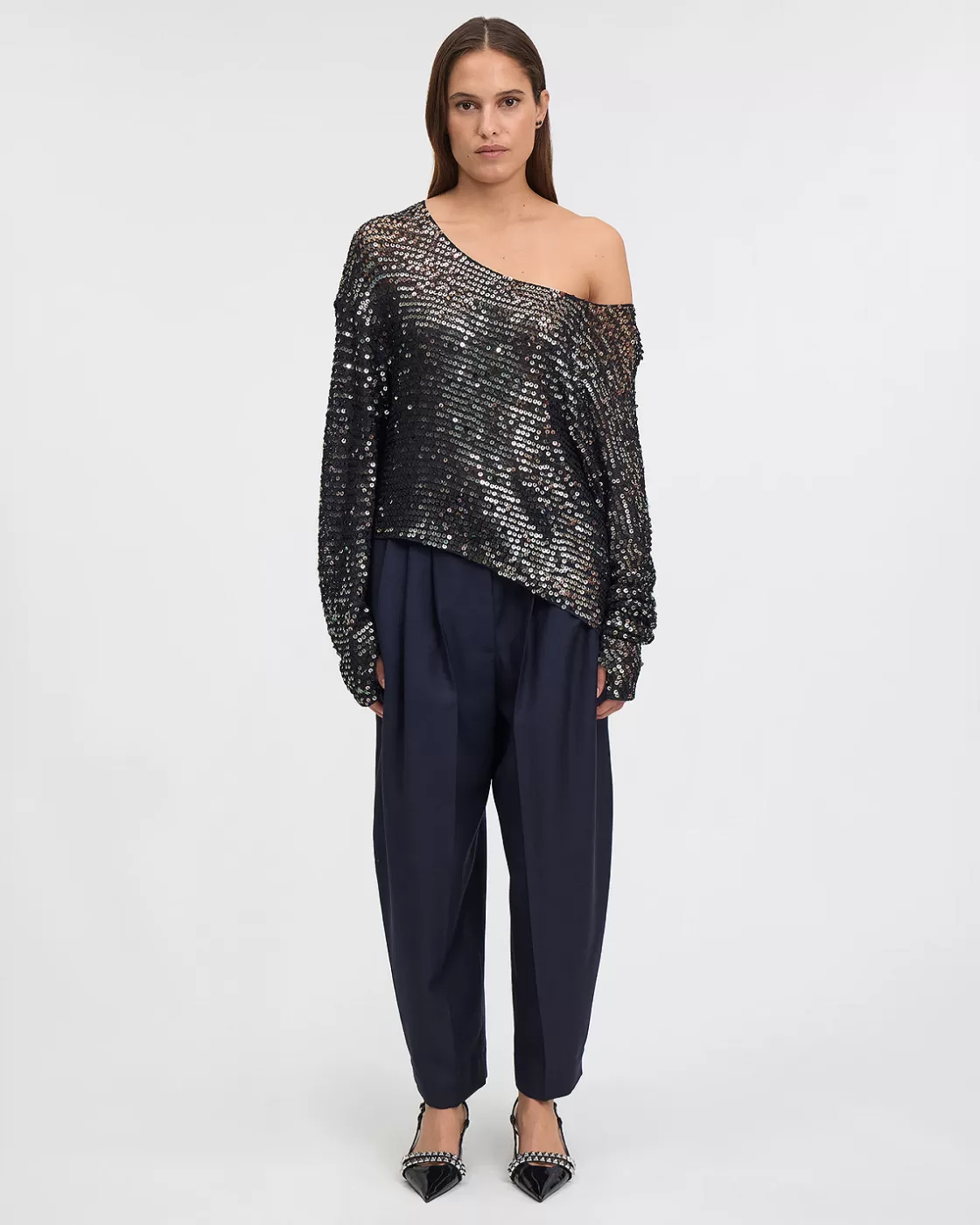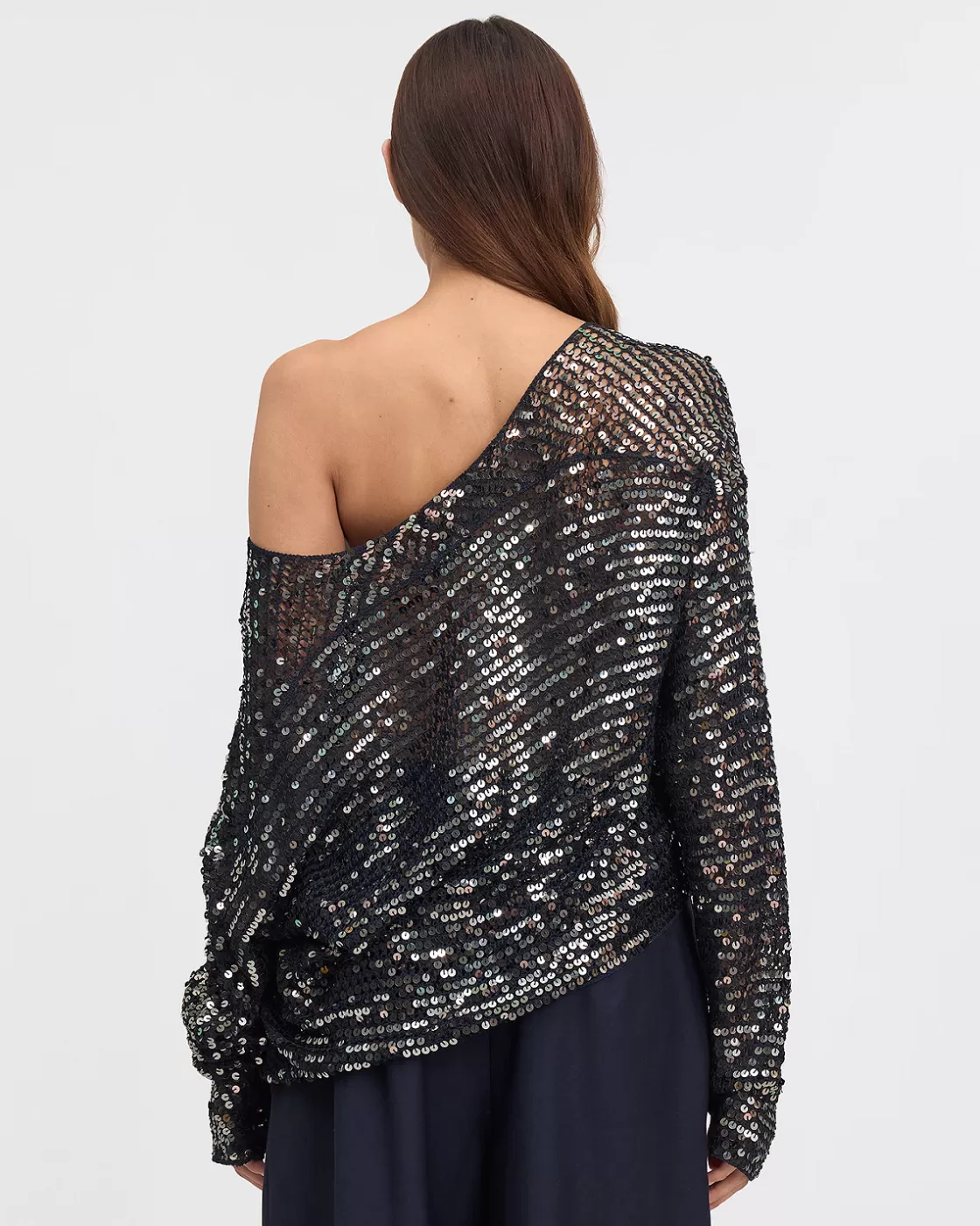 Immerse yourself in sophisticated elegance with our charcoal sequin mesh sweater. Featuring a scoop boat neckline that gracefully accentuates your figure, this sweater embodies the perfect marriage of style and comfort. Its soft material adapts beautifully to your waist, while its extra-long sleeves add a modern touch, with a practical thumb loop detail, ensuring an impeccable fit while keeping you warm and fashionable. The subtle glow of sequins adds extra dimension to this sweater.
