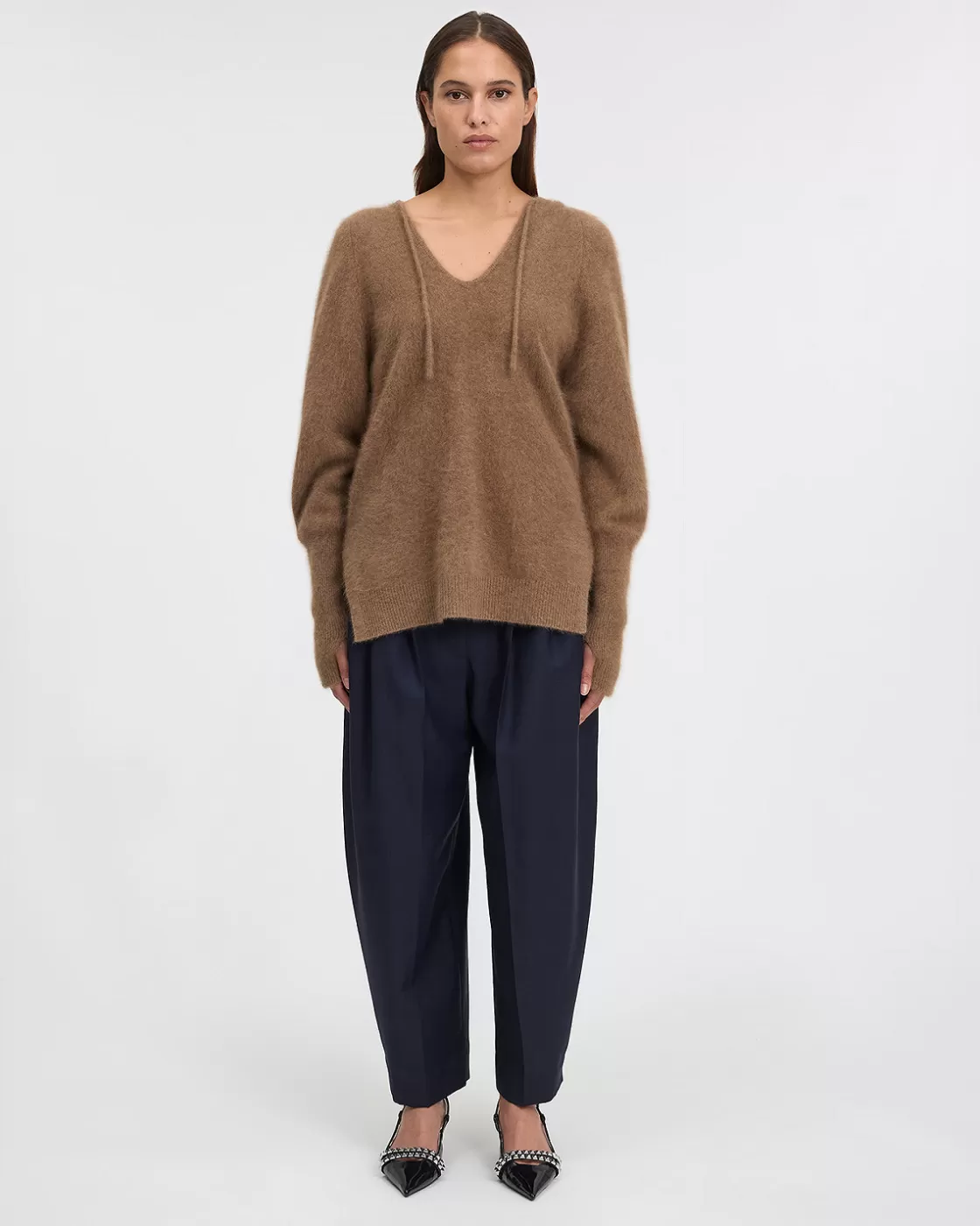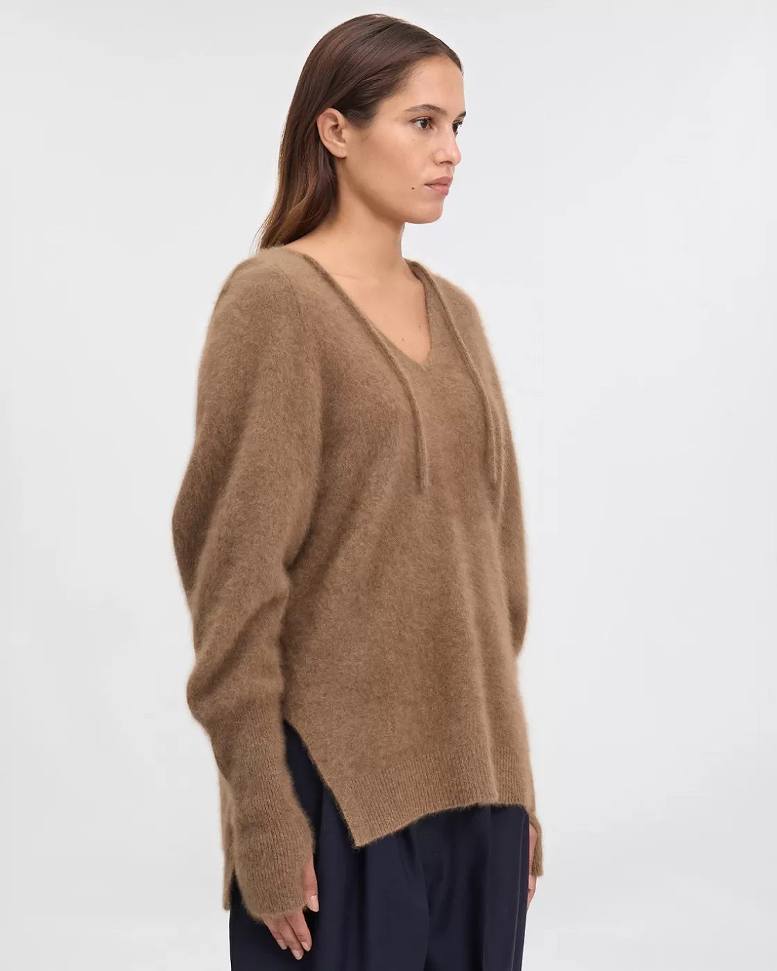 Our refined, lightweight raccoon wool hoodie, in sumptuous brown, offers a sleek, straight fit that's slightly longer at the back. It features a V-shaped opening on the front for a touch of modernity and a pretty hood. The ribbed sleeve ends have a practical thumb opening, combining style and functionality with finesse.